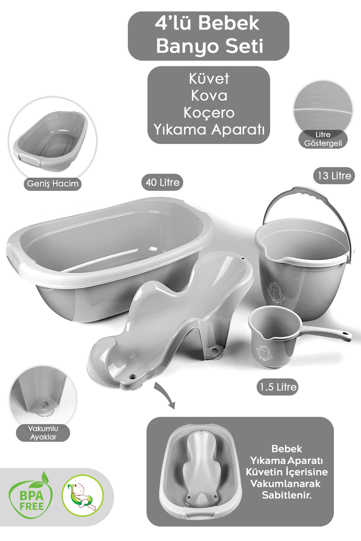 Meleni Baby 4'lü Bebek Banyo Seti - Bebek Yıkama Küveti - Vakumlu Yıkama Aparatı - Su Kovası - Maşrapa - Gri ürünü ucuz fiyat, hızlı kargo imkanı ile hemen sitemizden sipariş verin.