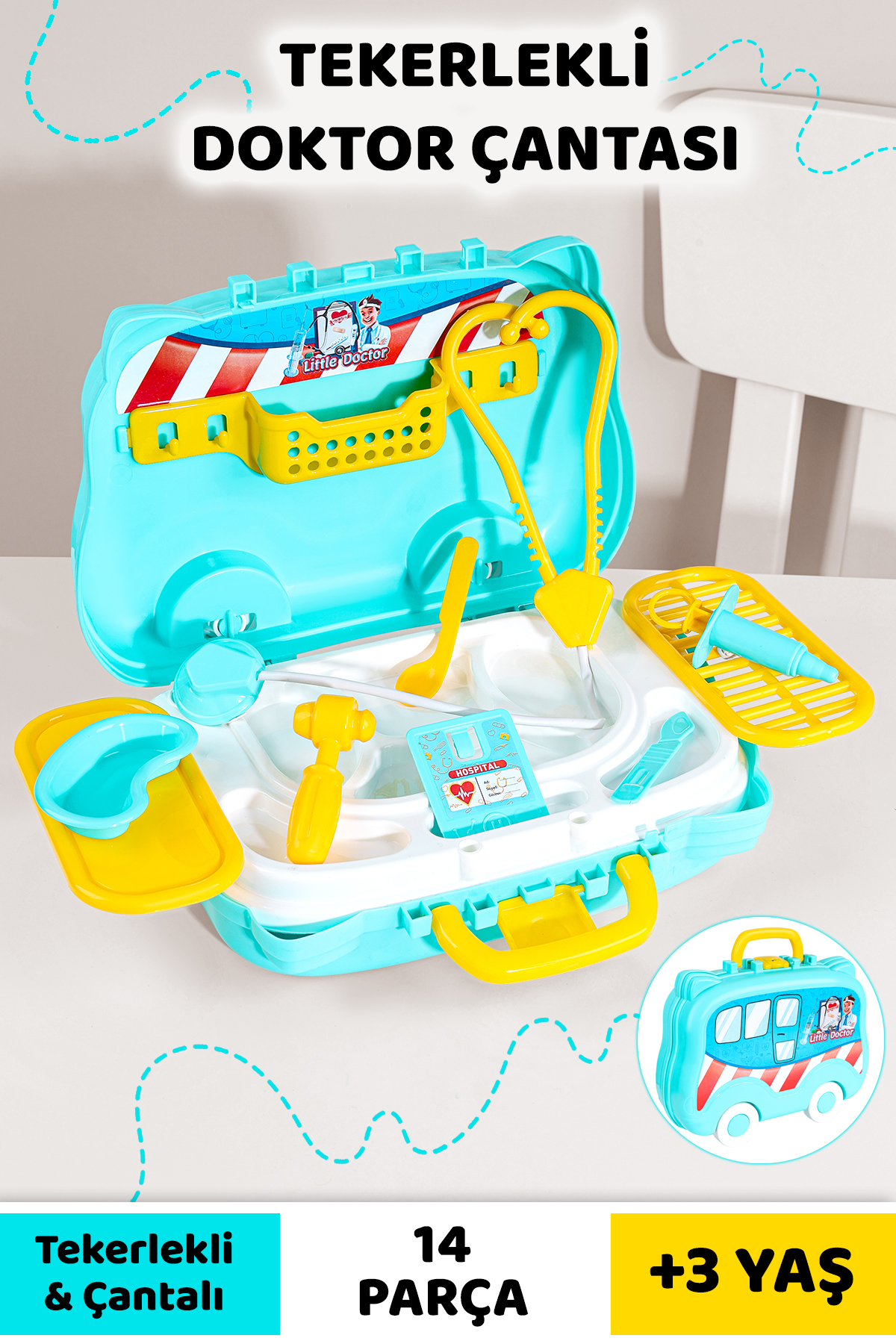 Meleni Toys 14 Parça Tekerlekli Oyuncak Doktor Seti – Çantalı Çocuk Hastane Meslek Oyunu Eğitici Öğretici Oyun