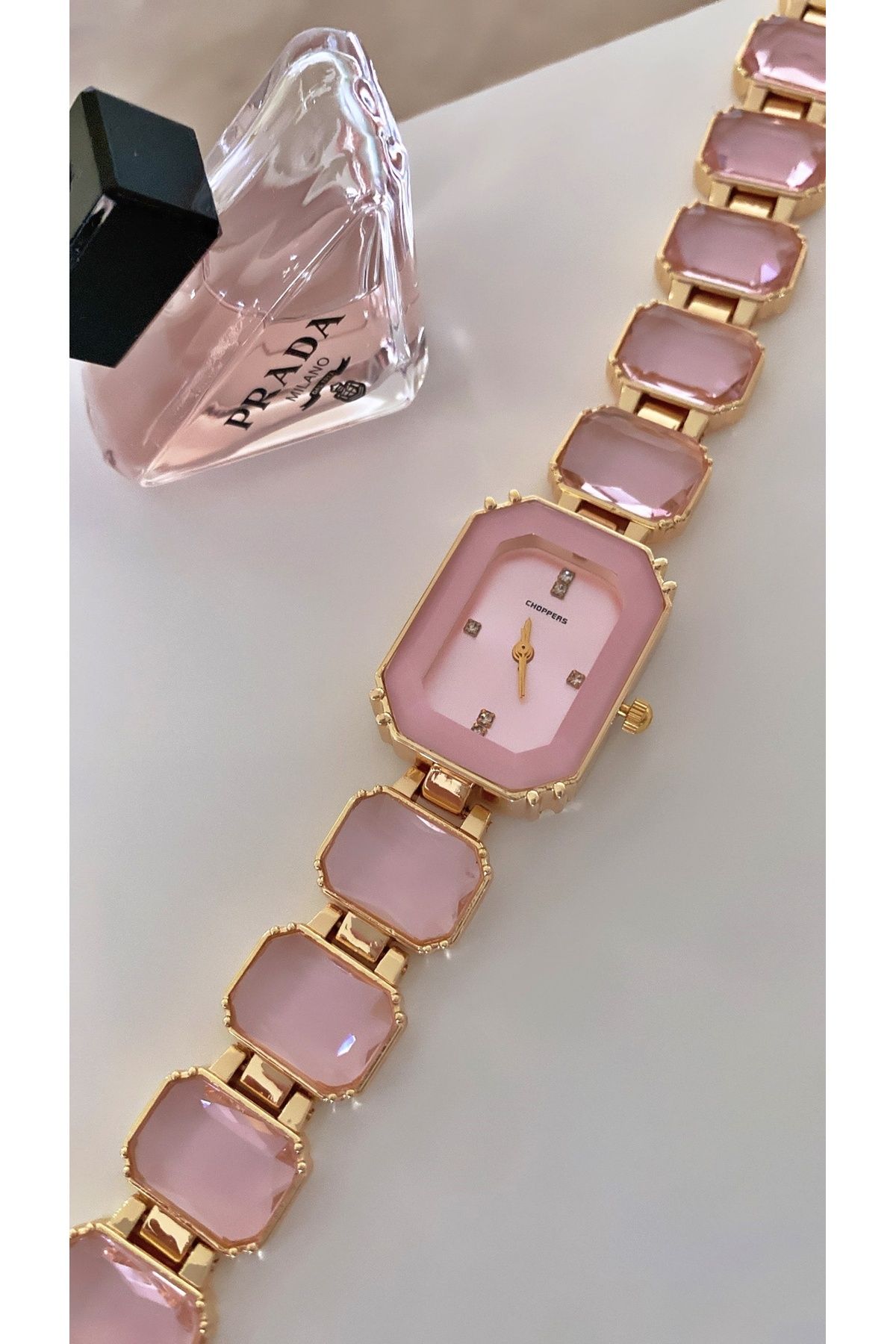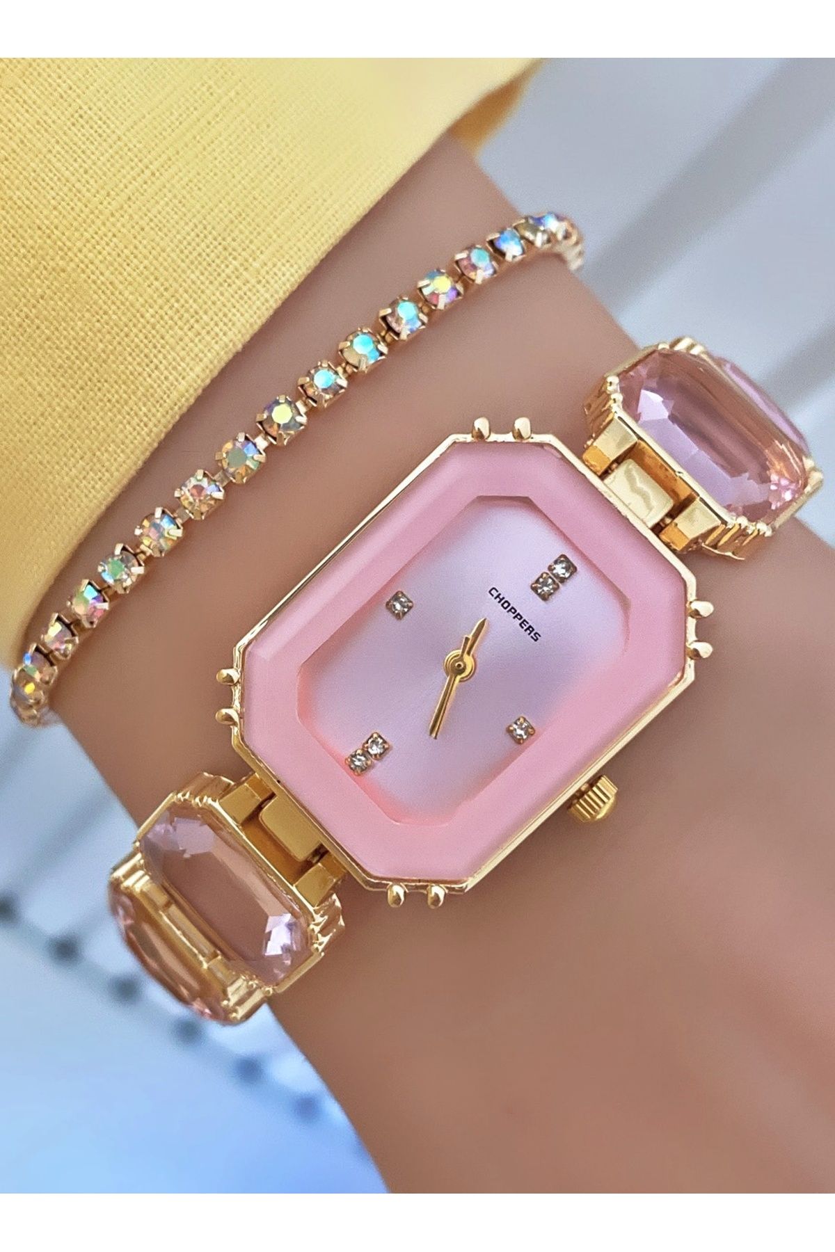 4 taşlı zarif kadranı ve göz alıcı pembe taş detaylı bilezik yapısıyla her stile uyum sağlar.