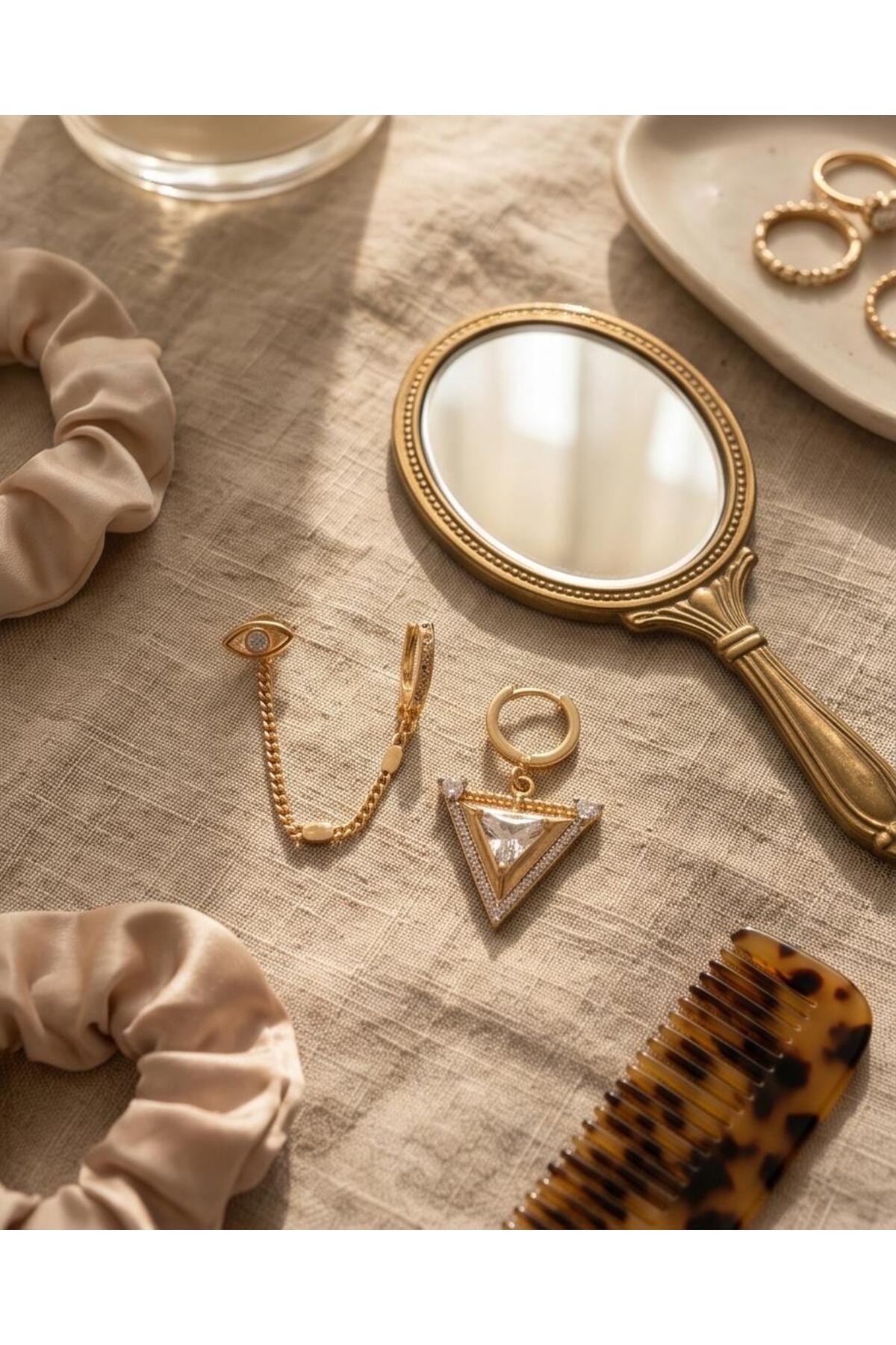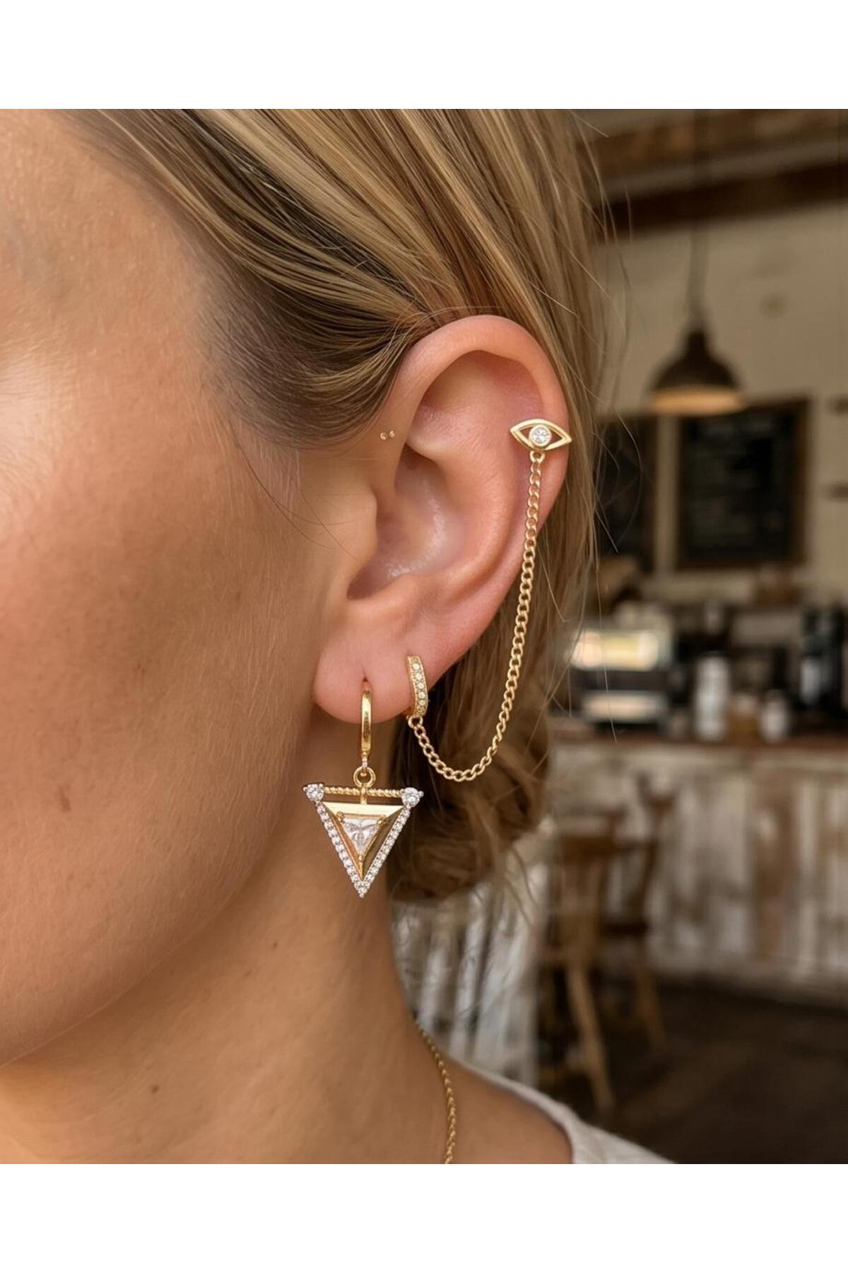 MERVAN TAKI 3’lü Kombin Zincir Detaylı Küpe Seti – Göz Figürlü Taşlı Halka Modern Kadın Küpe