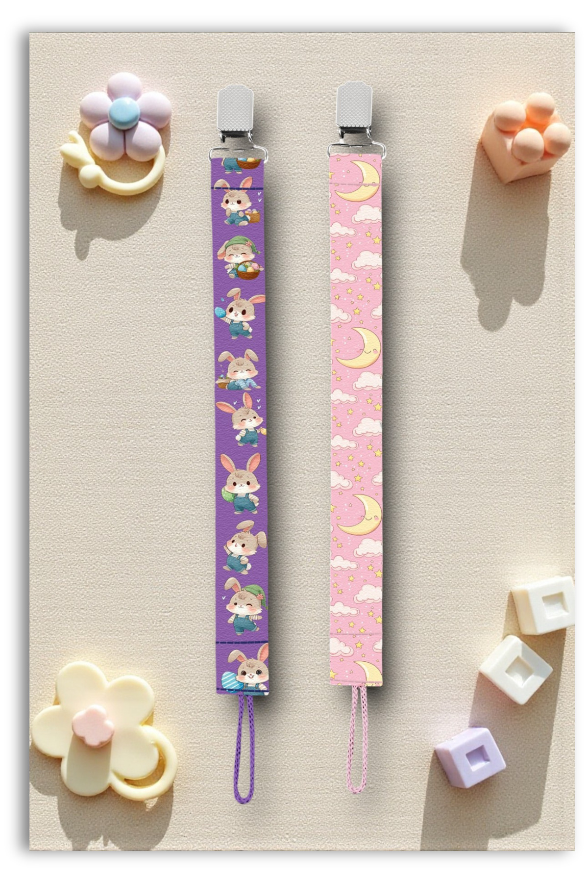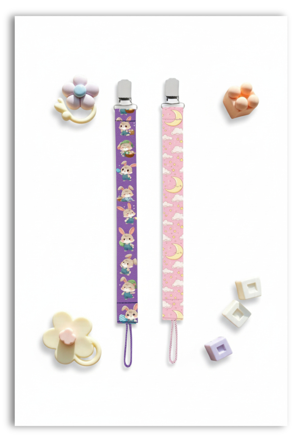 Mia Aurora 2li Set Emzik Askısı Emzik Zinciri Emzik Tutacağı Tavşan Ay Bulut Desenli Mor Pembe BYI64061