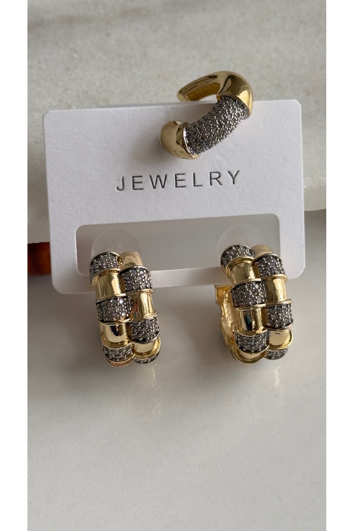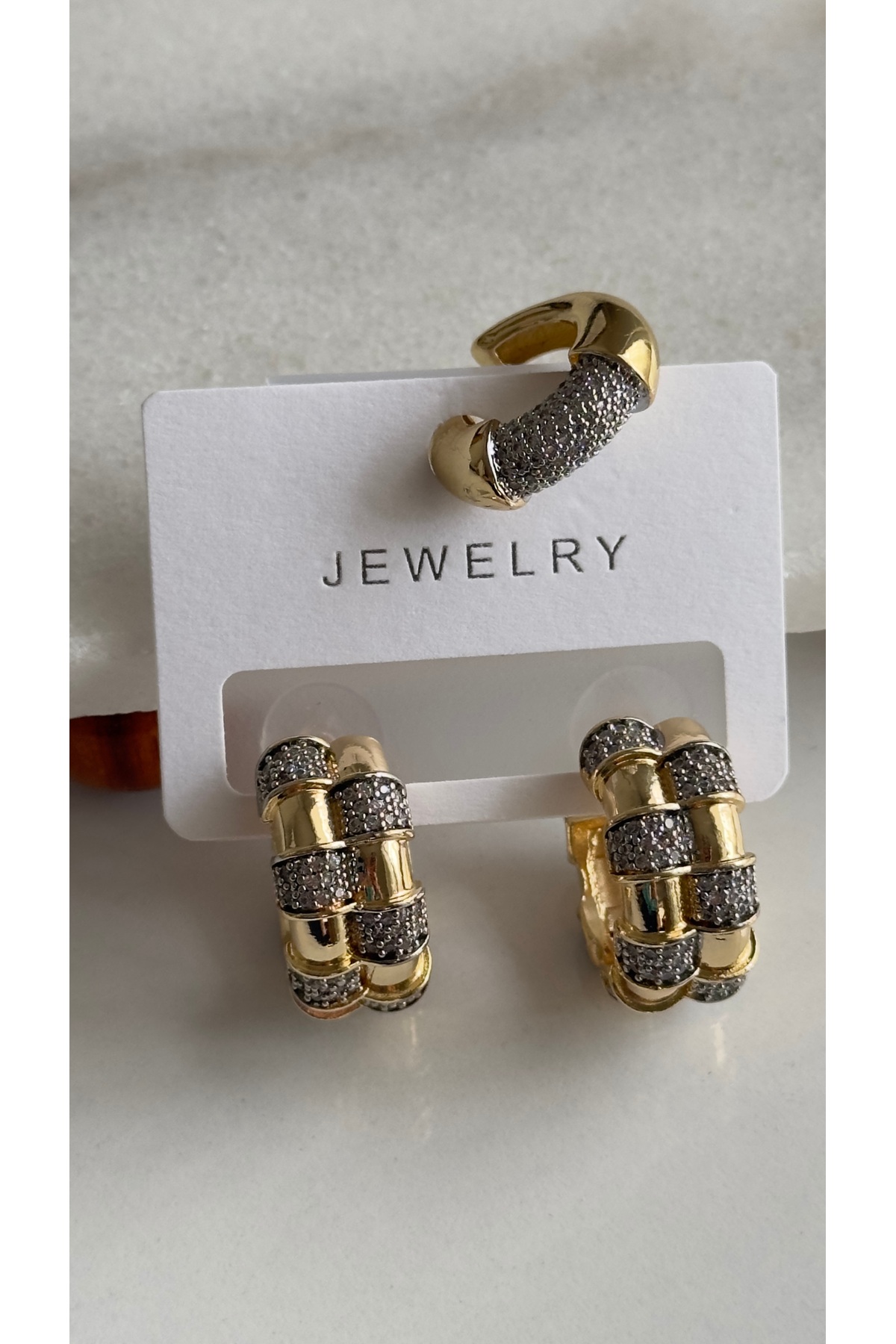 mibrillo Marka muadili taşlı halka küpe ve earcuff ( eşref tek Nisan küpe . Demet Özdemir 3lü küpe seti )