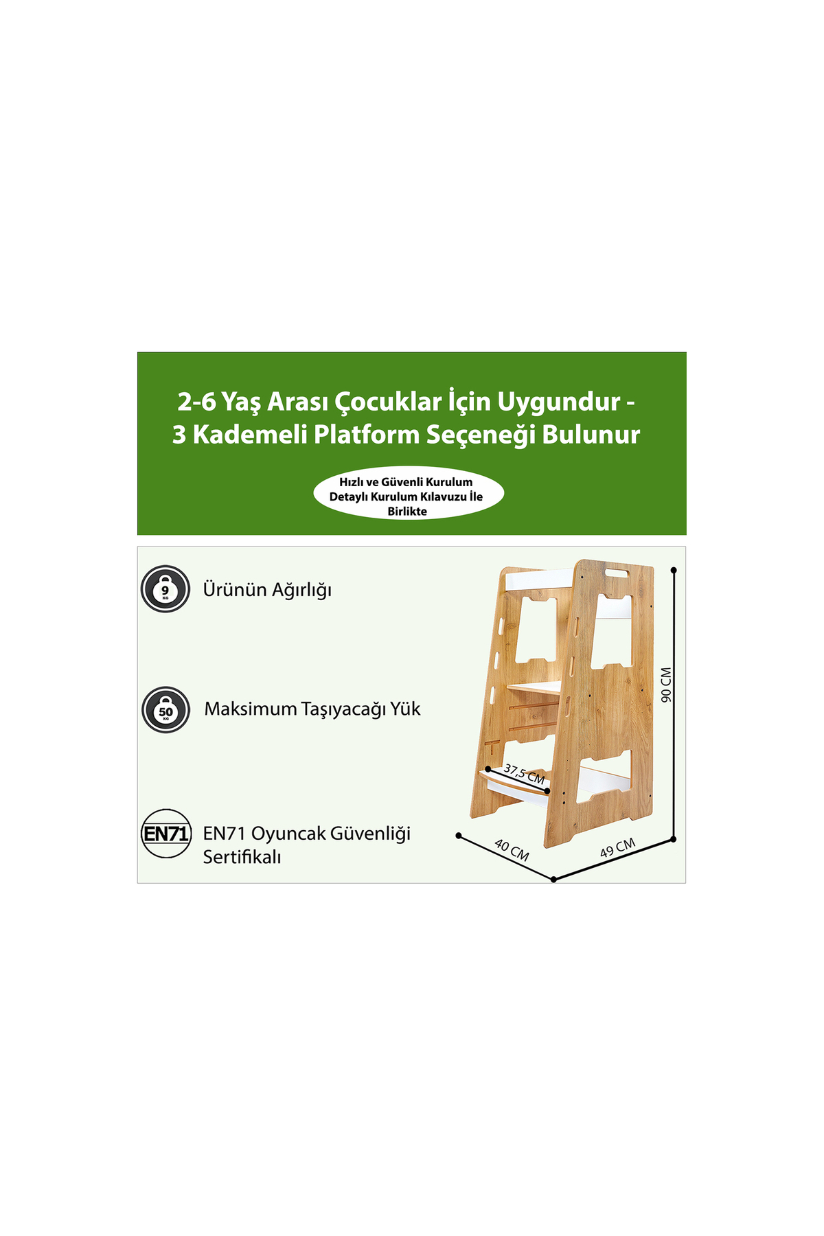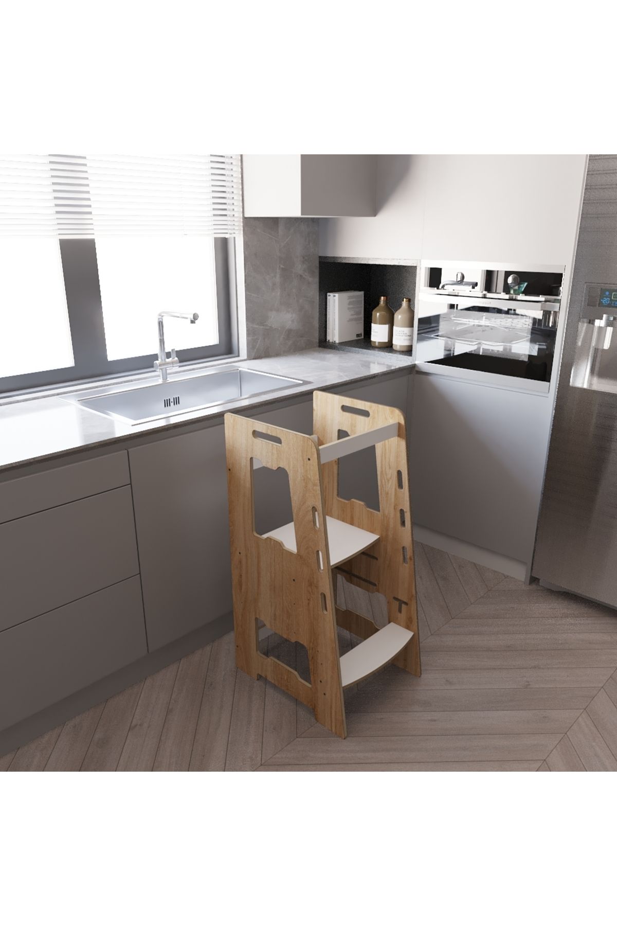 Minera Ahşap Montessori Öğrenme Kulesi / 2-6 Yaş / Naturel-Beyaz Öğretici-Eğitici