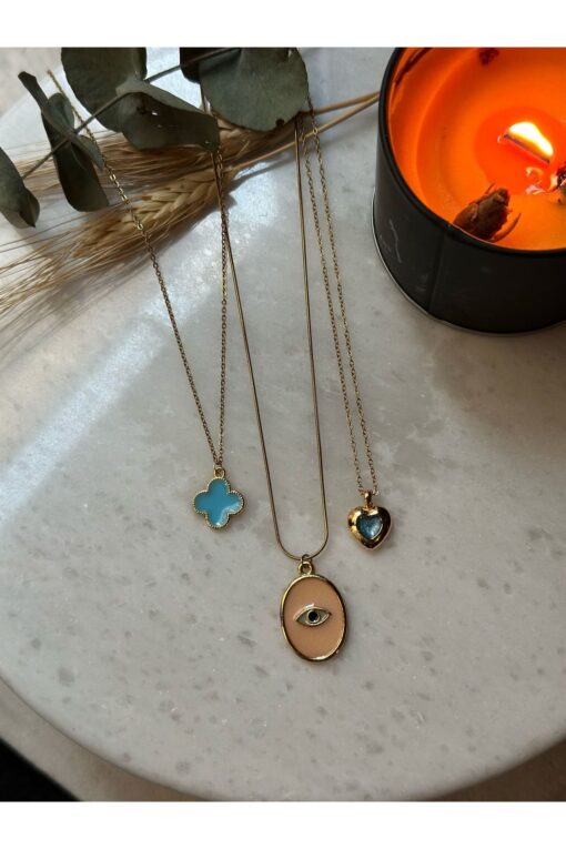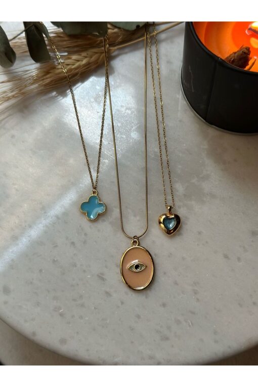 MİOSA 316L Kararmaz Çelik Altın Kaplama Yonca/Kalp Üçlü Kolye Seti