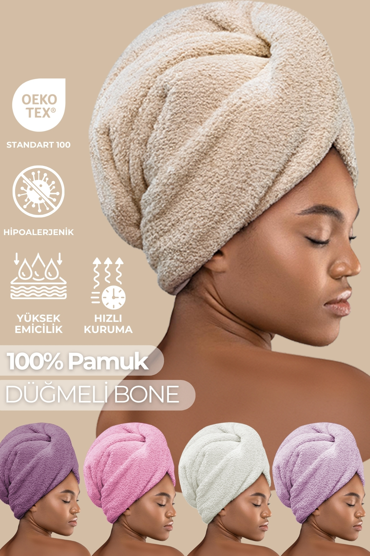 Miss Paris Home Düğme Lastikli Saç Havlusu, Saç Bonesi, Makyaj Bonesi, Yüz Bakım Havlusu, Banyo Sonrası Saç Kurutma