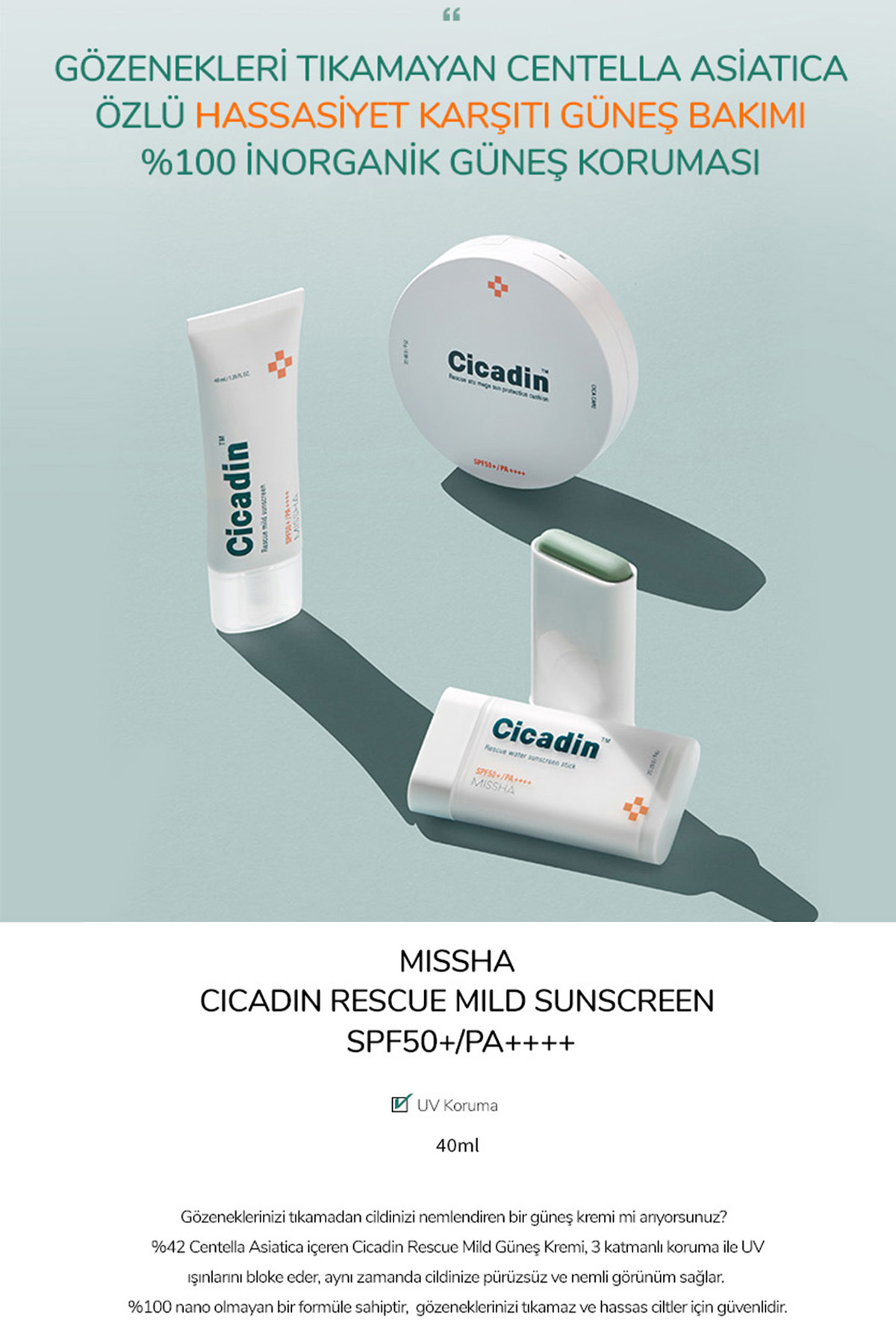 Missha Hassas Ciltler İçin Hafif Dokulu Güneş Kremi Cicadin Rescue Water Sunscreen SPF50+ PA++++ 40ml