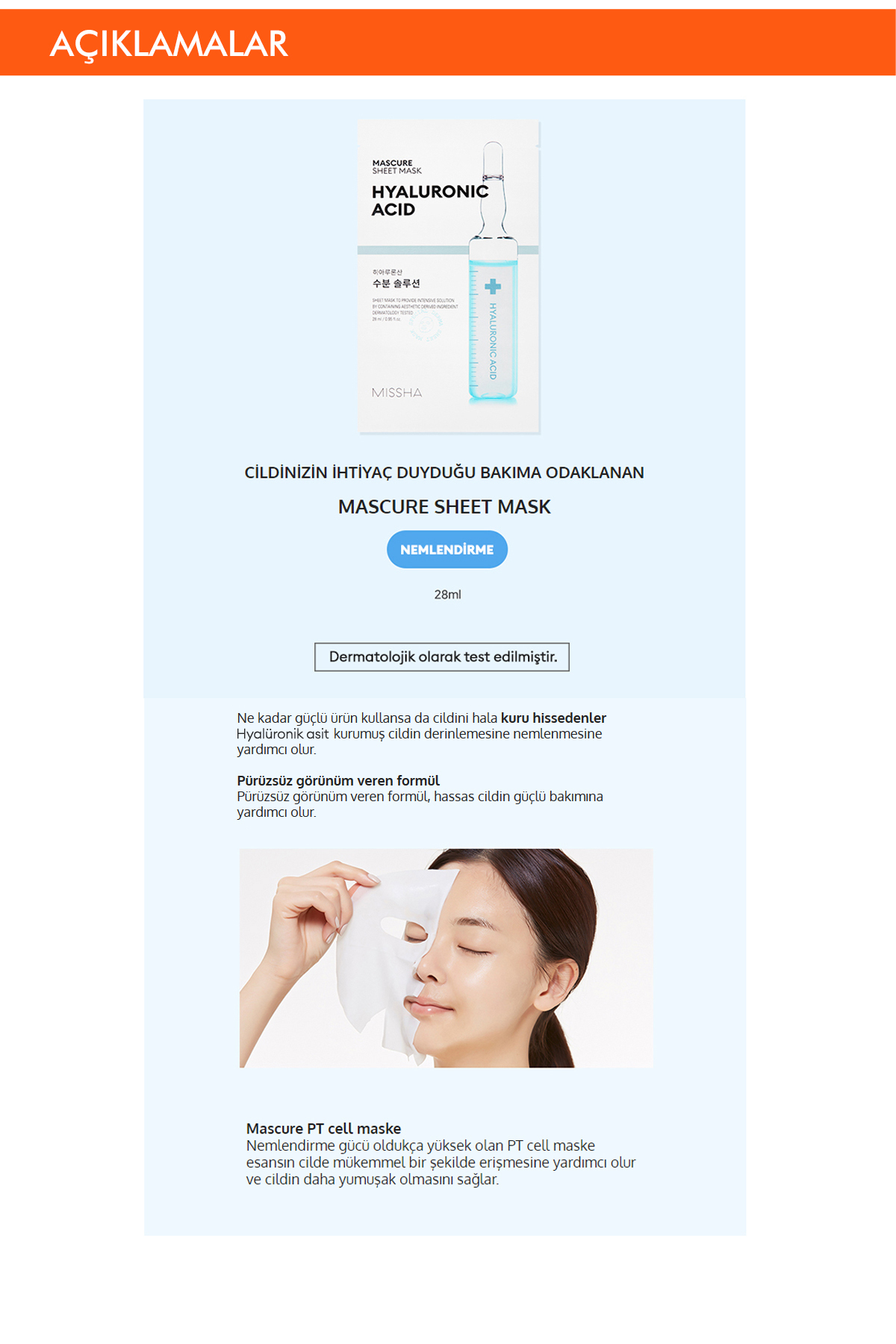 Missha Hyalüronik Asit İçerikli Nemlendirici Maske Mascure Hydra Solution Sheet Mask Hyaluronic Acid ürününü en uygun fiyata kozmetikara.com sitemizden sipariş verebilirsiniz.
