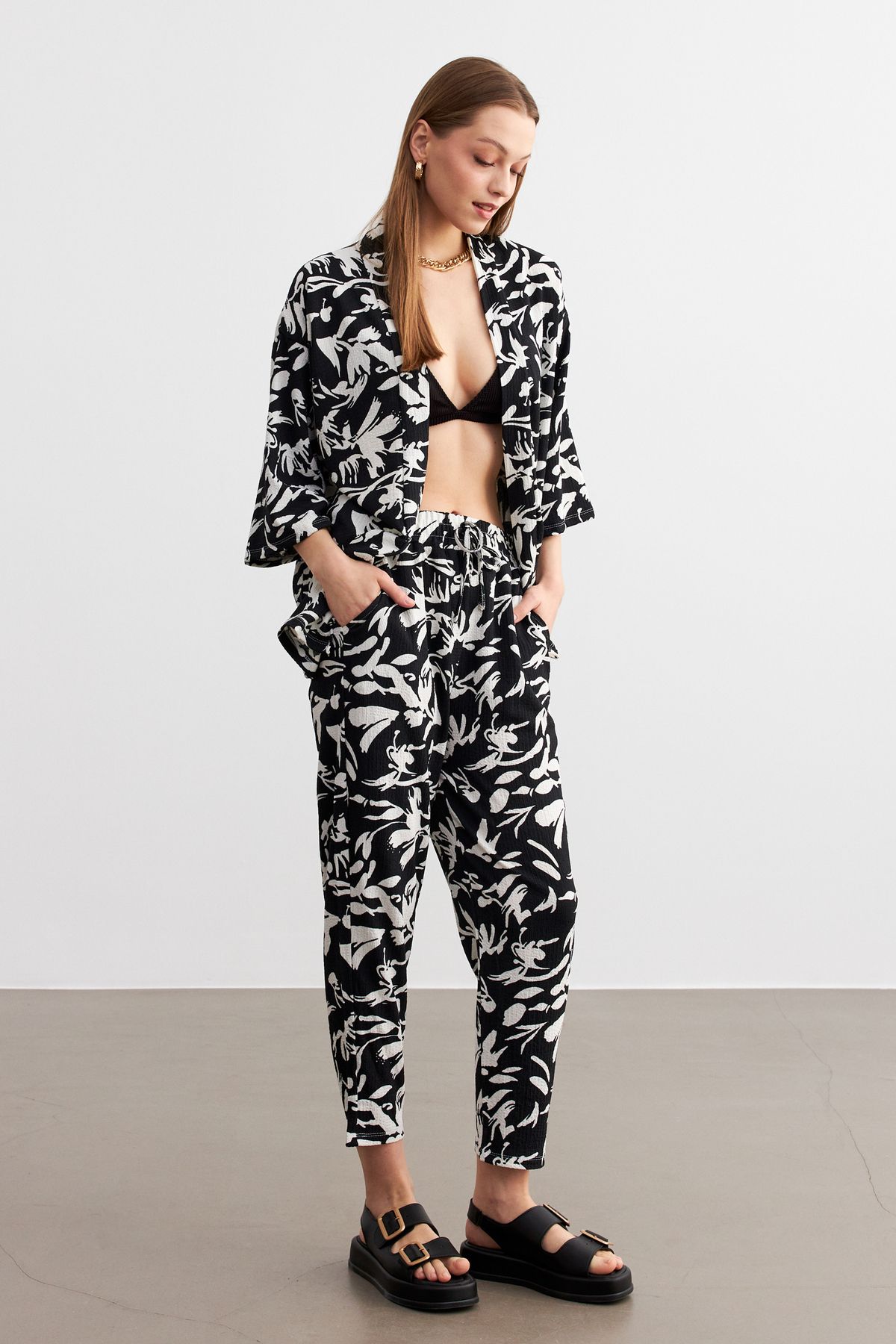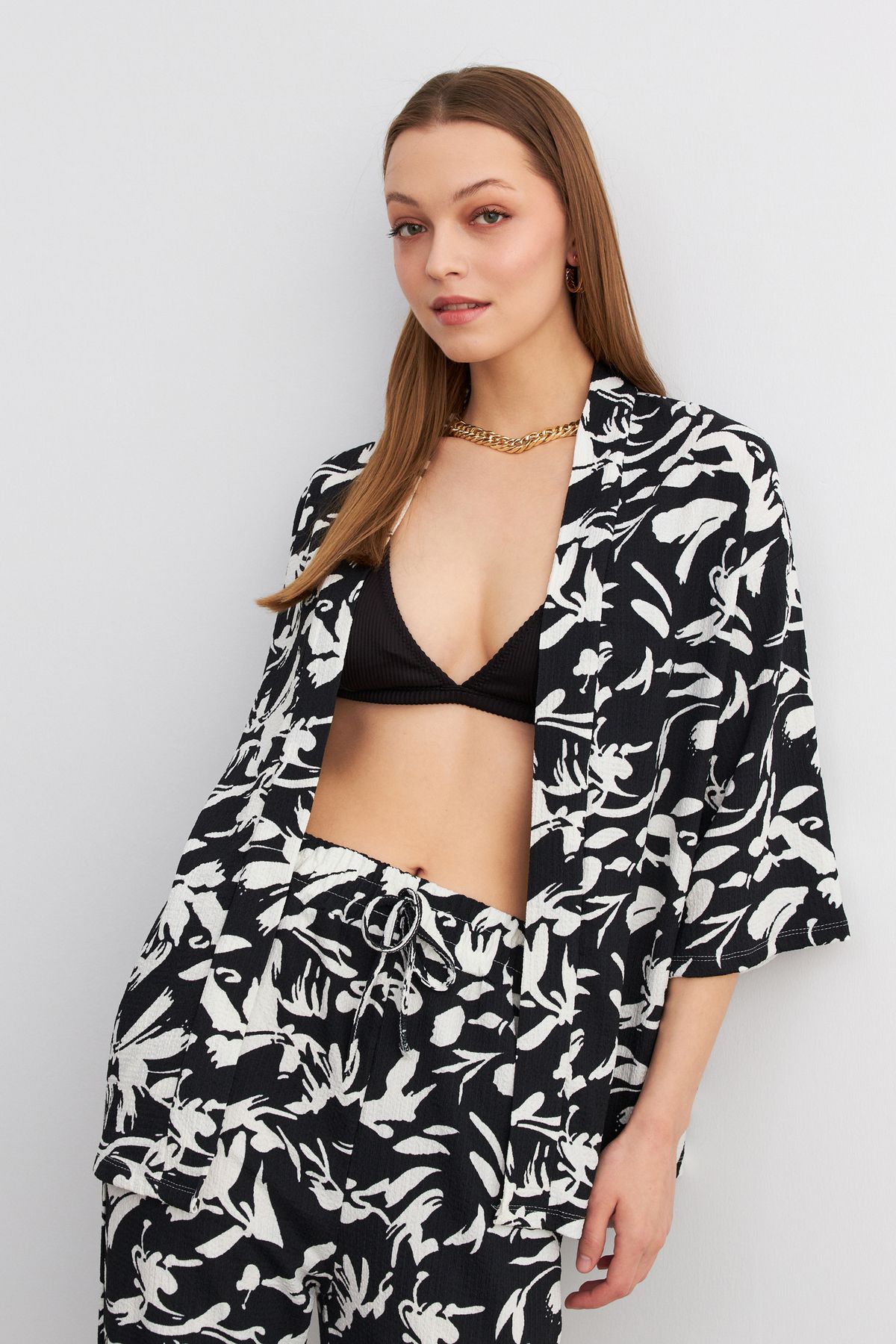 MODAGEN Kadın Siyah-Beyaz Desenli Kimono Gömlek Pantolon Takım ürünü ucuz fiyat, hızlı kargo ve kredi kartına 12 ay taksit imkanı ile hemen sitemizden sipariş verin.