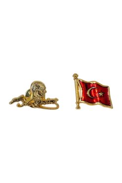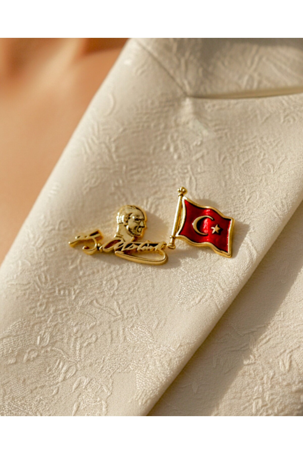 modamira Altın Rengi Atatürk ve İmzası İle Türk Bayrağı 2 Adet Yaka Rozeti