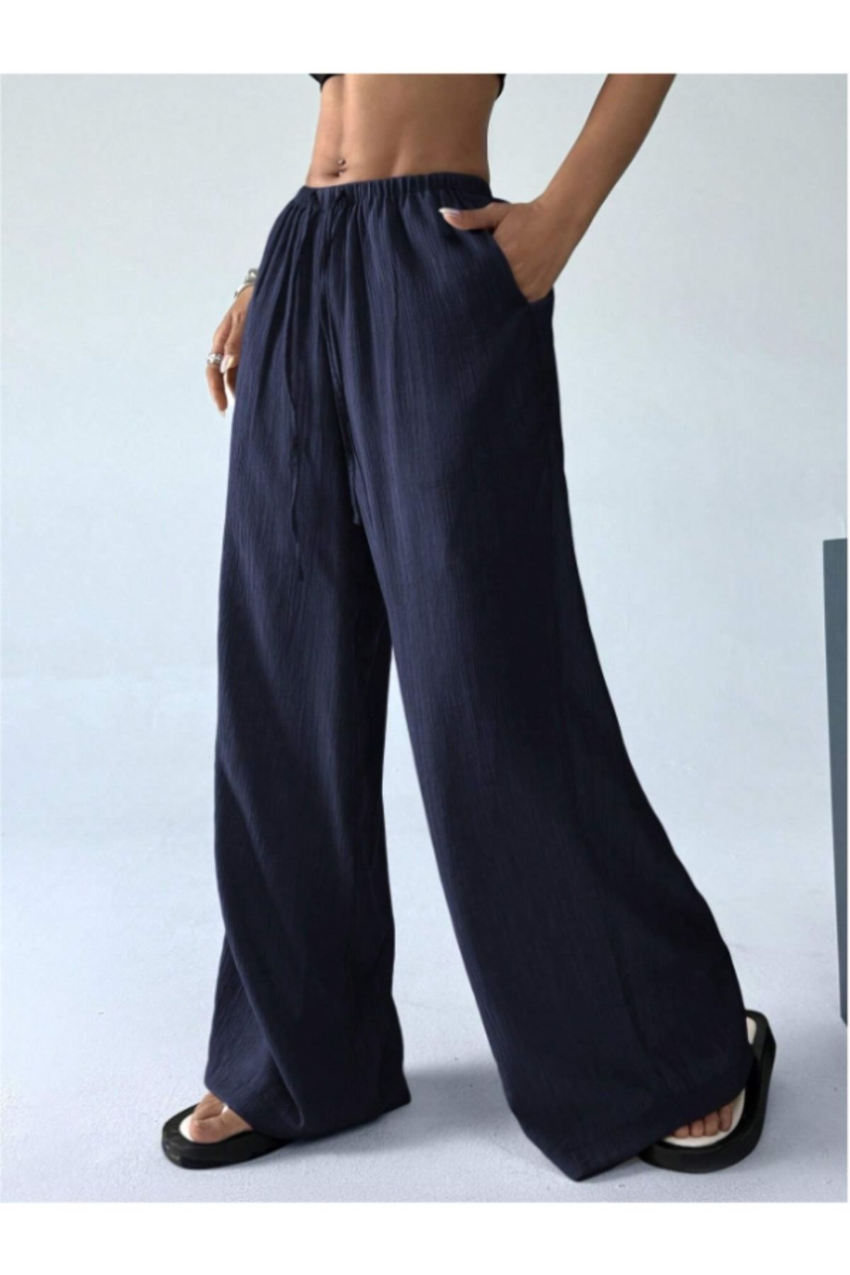 MOONBULL Kadın Bürümcük Kumaş Bel Bağlamalı Dokuma Geniş Paça Pantolon