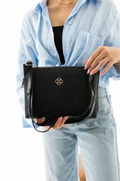 İş hayatında şıklığı ve fonksiyonelliği bir arada sunan siyah nubuk üç bölmeli vegan deri ayarlanabilir omuz çantası, her yaş grubuna hitap eden tasarımıyla dikkat çeker