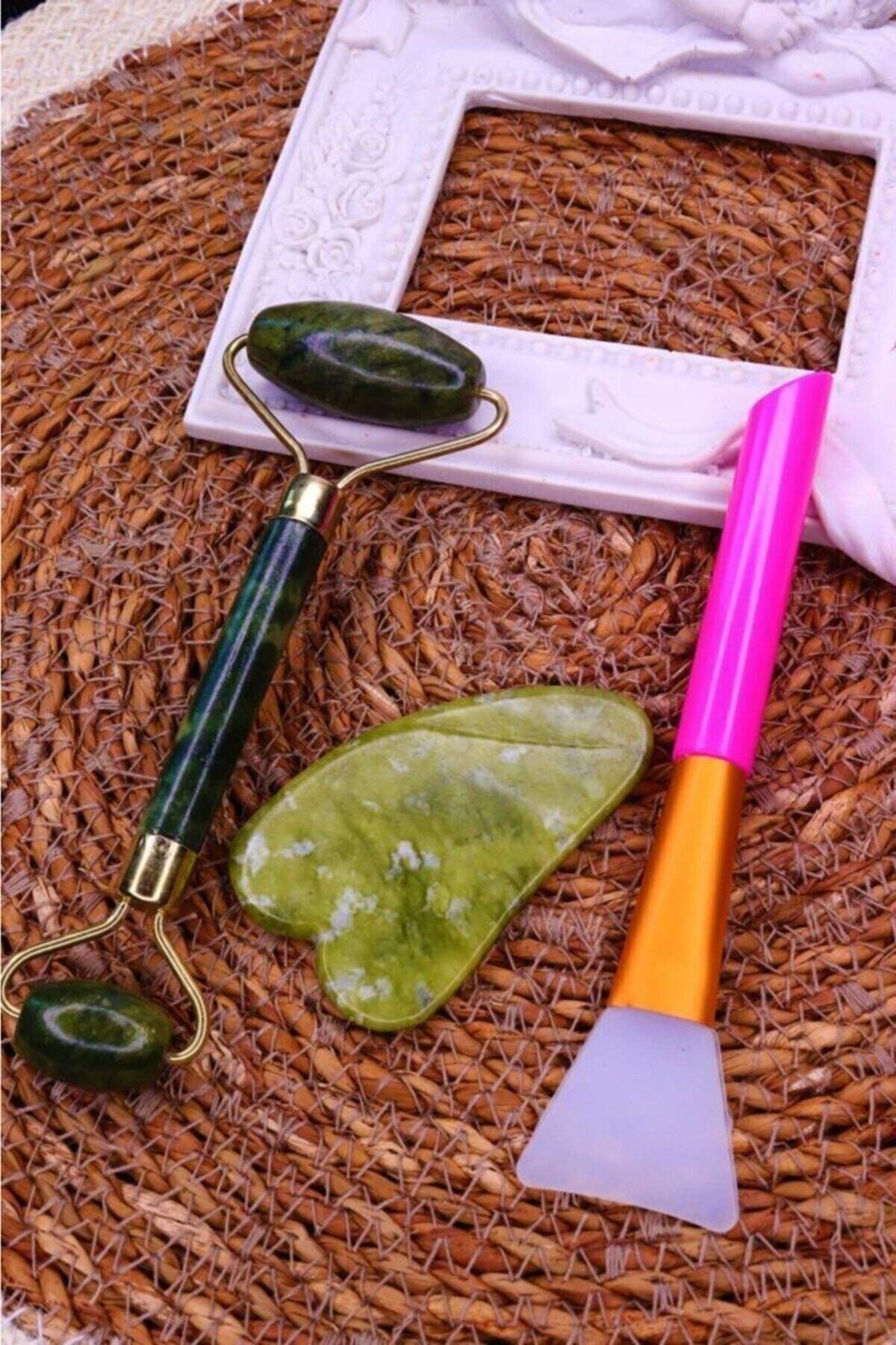MUJGAN 3’lü Cilt Bakım Seti Yeşim Taşı + Gua Sha Masaj Taşı + Maske Sürme Aparatı Beyaz