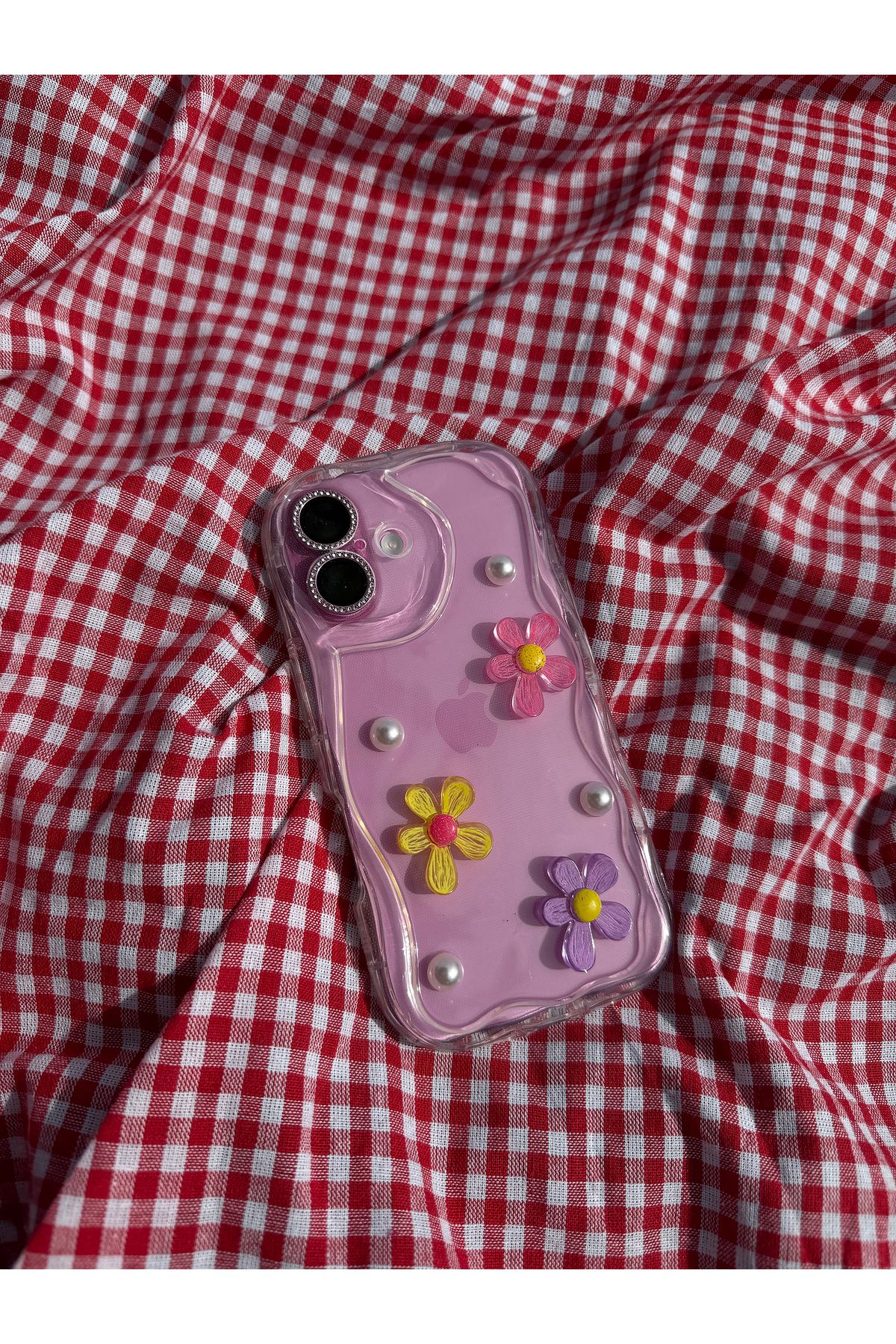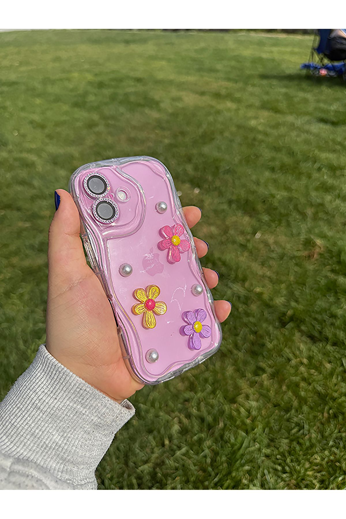 MustCase Iphone 16 Uyumlu Kılıf Dalga Kenarlı Darbeye Karşı Dayanıklı İncili Çiçek Tasarımlı Şeffaf Kılıf