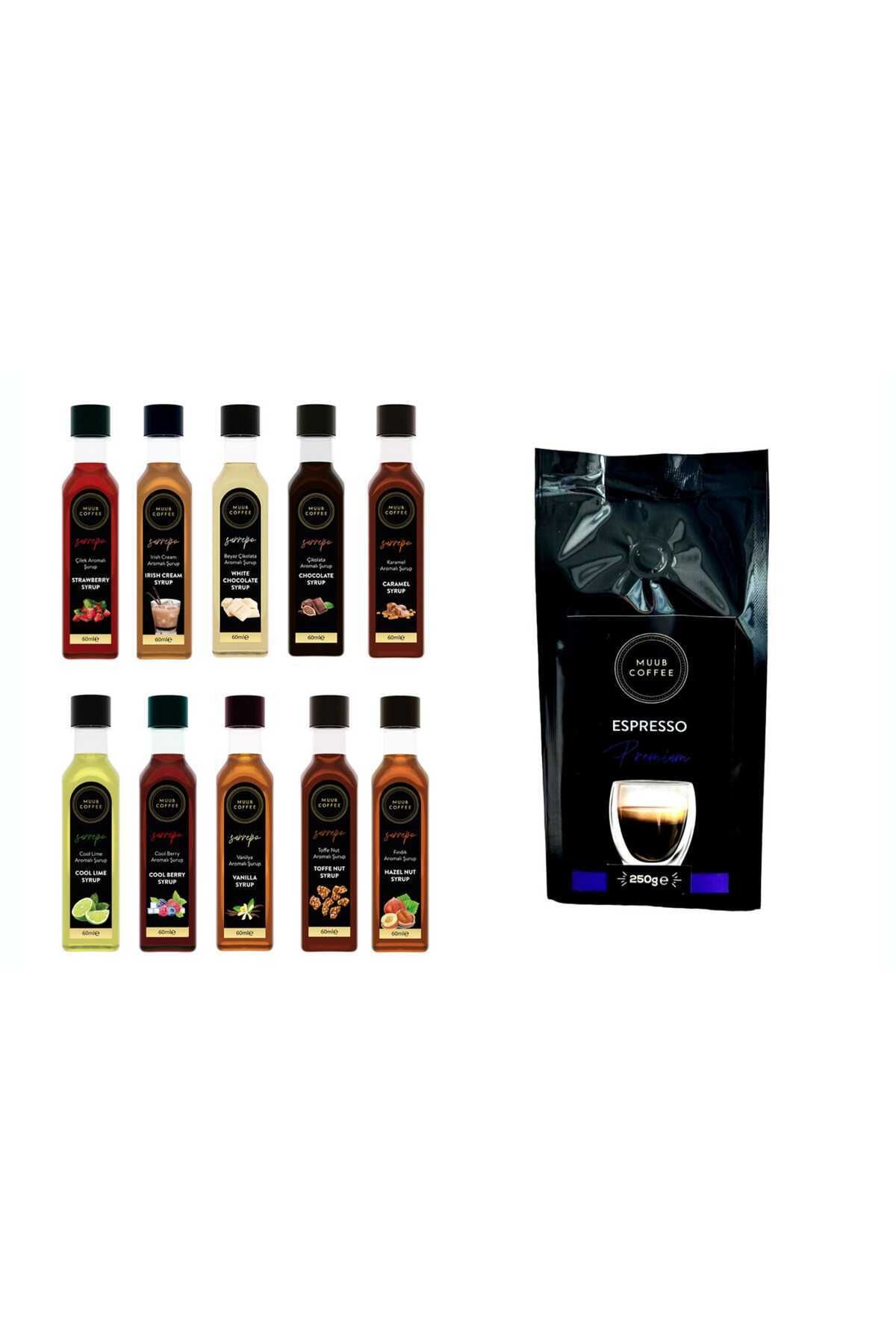 MUUB COFFEE AVANTAJLI PAKET 10 LU ÖZEL FORMÜLİZE ŞURUP SERİSİ + ESPRESSO PREMİUM ÇEKİRDEK 250 GR (çilek,ırısh cream,beyaz çikolata,çikolata,karamel,cool lime,cool berry,vanilya,toffe nut ve fındık şurup)