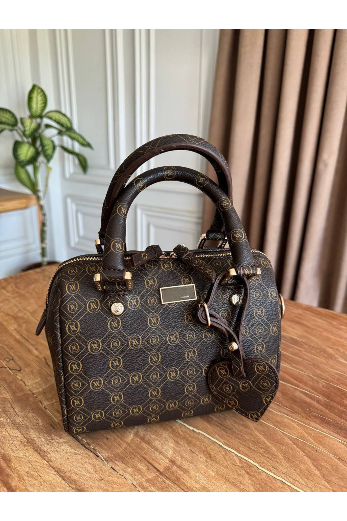 MyleeButik Kahverengi Kadın Monogram Desenli Kalp Charm El ve Omuz Çantası ürünü ucuz fiyat, hızlı kargo imkanı ile hemen sitemizden sipariş verin.