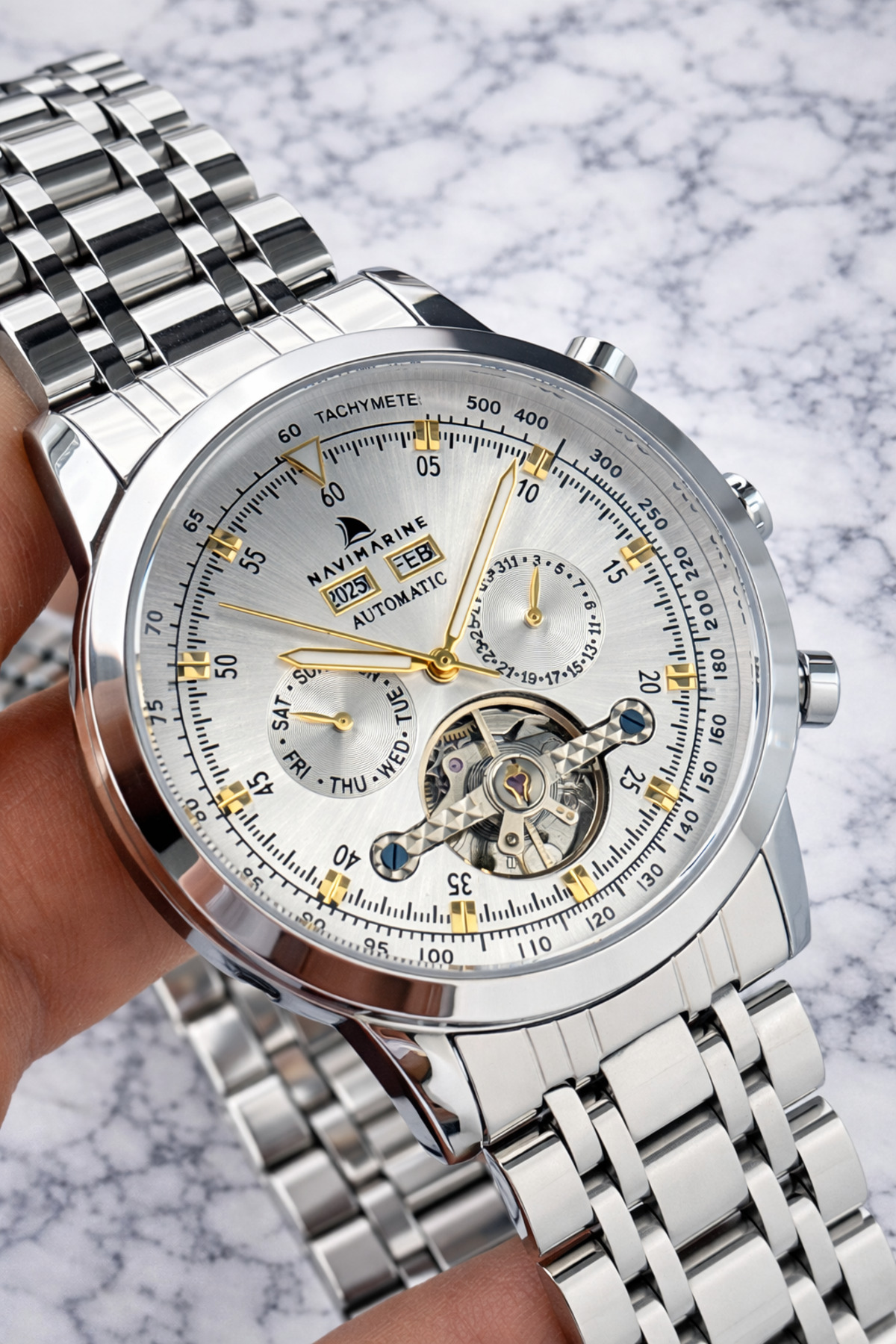 Navimarine Gümüş Renk Sarı İndeks Fonksiyonlu Business Otomatik Erkek Kol Saati + Bileklik Hediye
