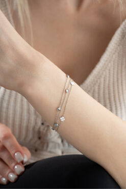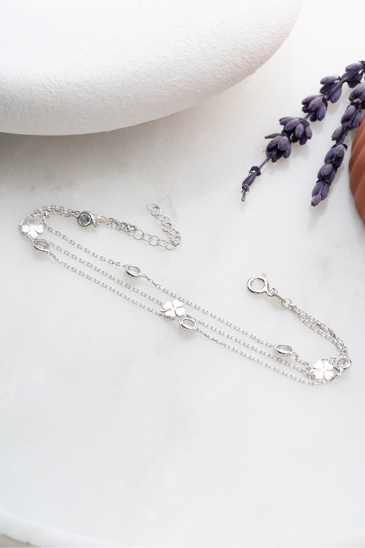 Nereze 925 Ayar Gümüş 3 Sıra Zincir Zirkon Taşlı Yonca Bileklik