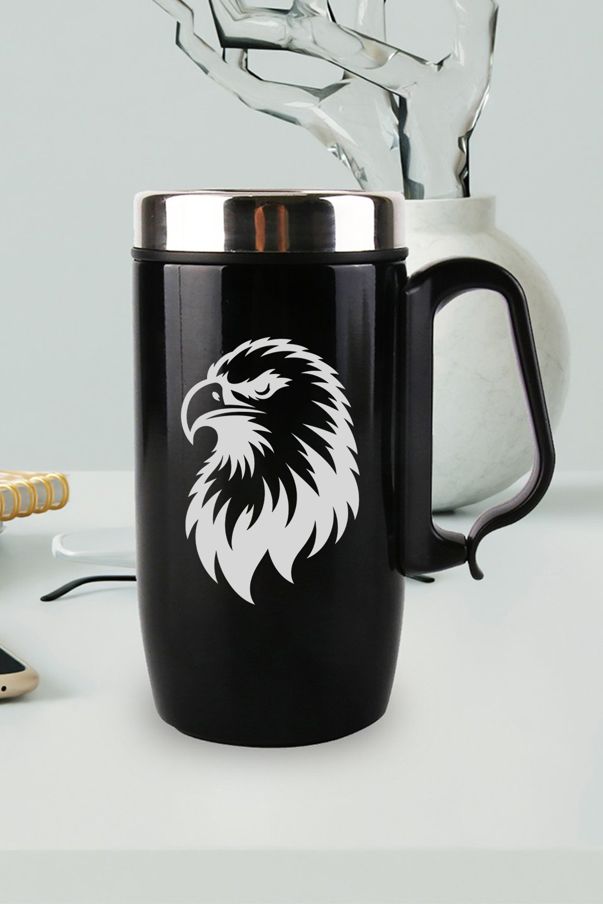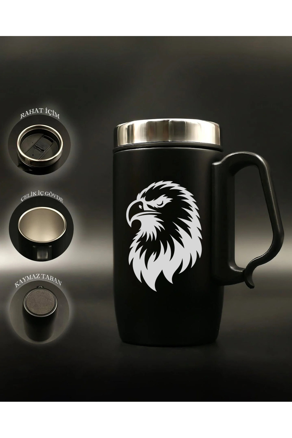 nesnelgift Siyah Çelik Kulplu Bardak Termos – Kartal Kafası Motifli