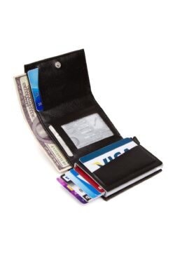 **Çantanın Ebat Bilgileri:** – Boy: 21cm – En: 17,5cm **Cüzdan Kartlık Ebat Bilgileri:** – Boyut: 7,5 x 10 cm **Ekstra Özellikler:** – Malzeme: Vegan deri ve yüksek kalite alüminyum – Renk: Siyah – 6 Adet Kredi Kartı Bölmesi – 1 Adet Nakit Bölme – RFID Korumalı – Otomatik Kızaklı Kartlık Mekanizması – Şık Kutu İçerisinde Gönderim