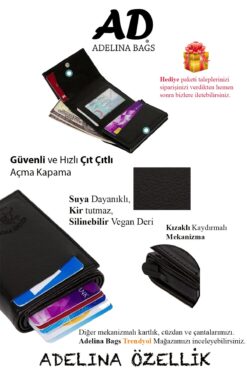 Cüzdan ölçüleri: 7×10 cm dir. Alüminyum Mekanizmalı Kızak İçerisine 5 Adet Kart Almaktadır. Ürünümüzde 1 Adet Diş Pencereli Ehliyet ve Kimlik Kartı Bölmesi, 1 Adet İç Kâğıt Para Bölmesi Mevcuttur. Birinci sınıf işçilikle vegan deriden üretilmiştir.