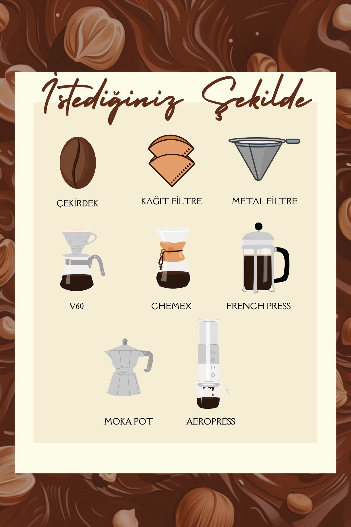 Fındığın çıtırlığı ve çikolatanın tatlılığı, kahveyle buluşarak sizi lezzet dolu bir yolculuğa çıkarıyor. Filtre kahve demleme tekniğinin incelikleriyle hazırlanan bu özel kahve, en kaliteli kahve çekirdeklerinin ustalıkla işlenmesiyle elde ediliyor. Fındık ve çikolata aromasıyla zenginleştirilen bu lezzetli içecek, içenleri büyüleyici bir tat yolculuğuna çıkarıyor. Her bir yudum, fındık ve çikolatanın mükemmel uyumunu hissettiriyor. Fındık ve çikolata aromalı filtre kahve, günün her anında size eşlik ediyor. İçindekiler: Fındık ve Çikolata Aroması, seçiminize göre Çekirdek Kahve veya Öğütülmüş Filtre Kahve Miktar: 200 Gr Kahvelerimiz haftalık olarak kavrulup günlük olarak öğütülmektedir. Siz sipariş verdiğinizde kahveniz sizin için özel olarak öğütülüp paketlenir. Paketlerimiz Kilitli Kahve Paketi şeklindedir evde saklamak için ayrıca kap almanıza gerek yoktur. Paketin içindeki havayı alıp klipsini kilitlemeniz yeterlidir. Demleme Yöntemleri: Chemex, V60 Dripper, Sifon Demleme, Coffee Syphon, Cold Brew, Aeropress, Mokapot, French Press, Filtre Kahve Makinesi, Ev Tipi Espresso Makinesi Uygulama Tarifi: 200 ml su için 12 gr (iki tatlı kaşığı) kahve istenilen demleme yöntemine göre demlenir. French Press demleme için 4 dakika kadar bekletilmesi yeterlidir. Kahvenizi demlerken kesinlikle çeşme suyu kullanmayınız. Kahve içme suyu ile demlenmelidir. Kahvenin suyu yumuşak olmalıdır ve kahve kireçli suyu sevmez.