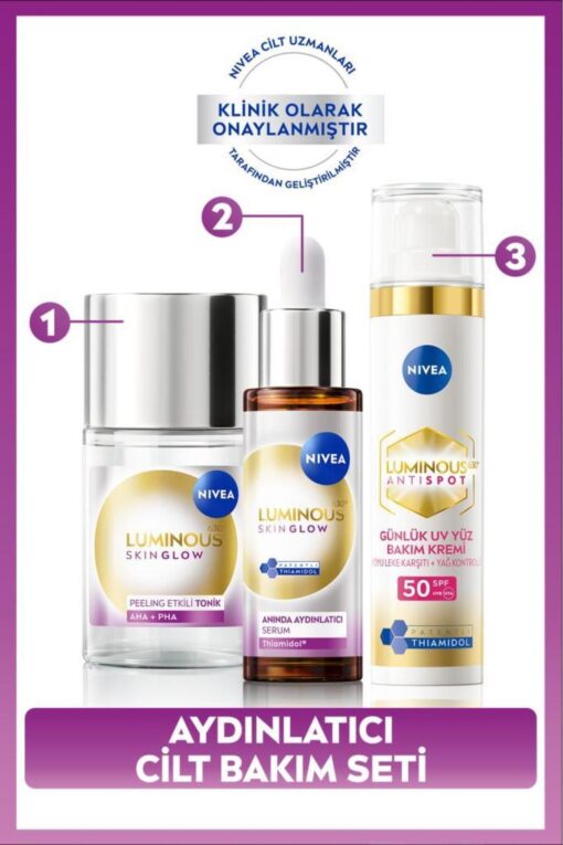 NIVEA SPF50 Luminous630 Leke Karşıtı Gündüz Yüz Kremi 40ml,Skin Glow Aydınlatıcı Serum 30ml ve Tonik 100ml en ucuz fiyata kozmetikara.com sitemizden sipariş verebilirsiniz.