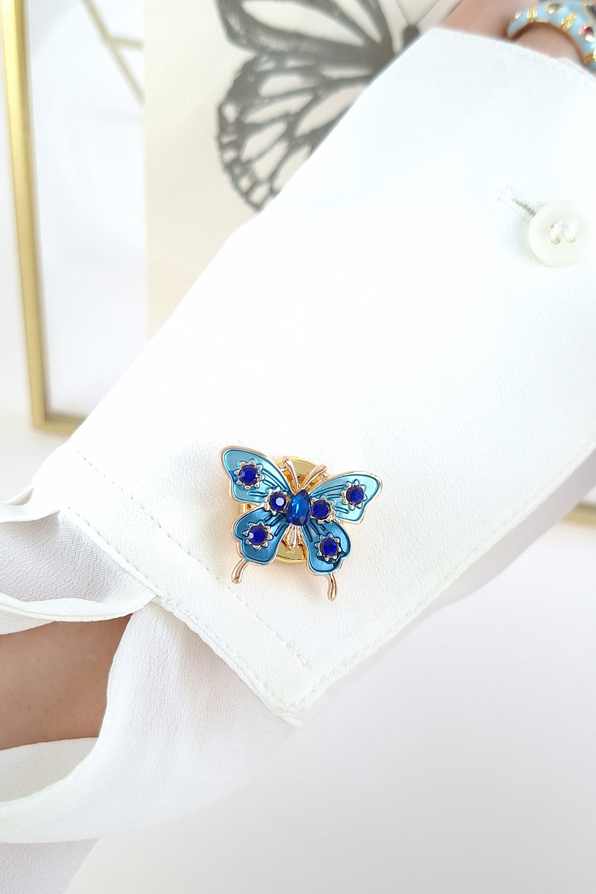 Norevia 4 Al 3 Öde Mavi Mineli Kelebek Model Lüks Yaka ve Kol Düğmesi Kapağı ve Broşu (1 adet)