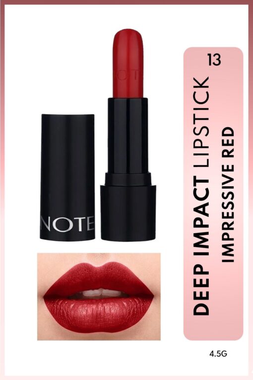 NOTE Deep Impact Lipstick Kremsi Dokulu Yarı Parlak Ruj 13 Impressive Red – Kırmızı en ucuz fiyata kozmetikara.com sitemizden sipariş verebilirsiniz.