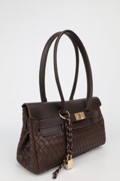 NOTHING Kadın Kahve Örgülü Deri Kemerli Charm Detaylı Kapaklı El Ve Omuz Çantası 16×30 Cm Pera