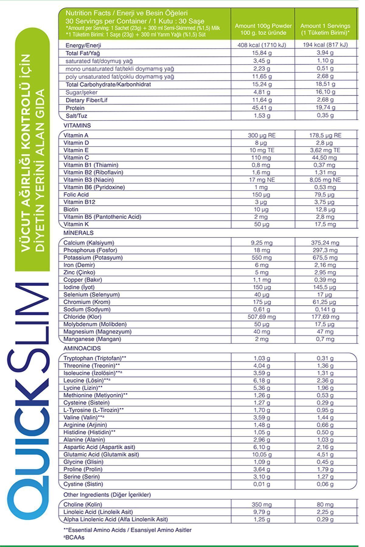 İÇERİĞİ: QUICK SLIM SHAKE MIX KUTU (23g x 30 saşe)
