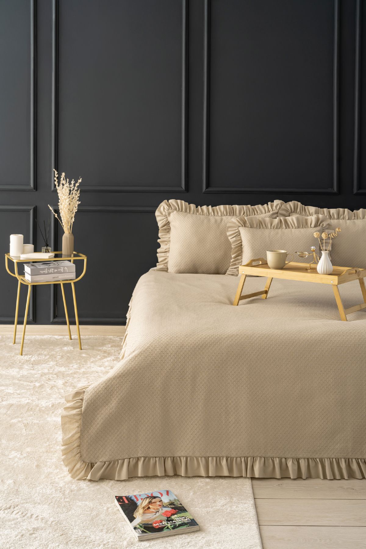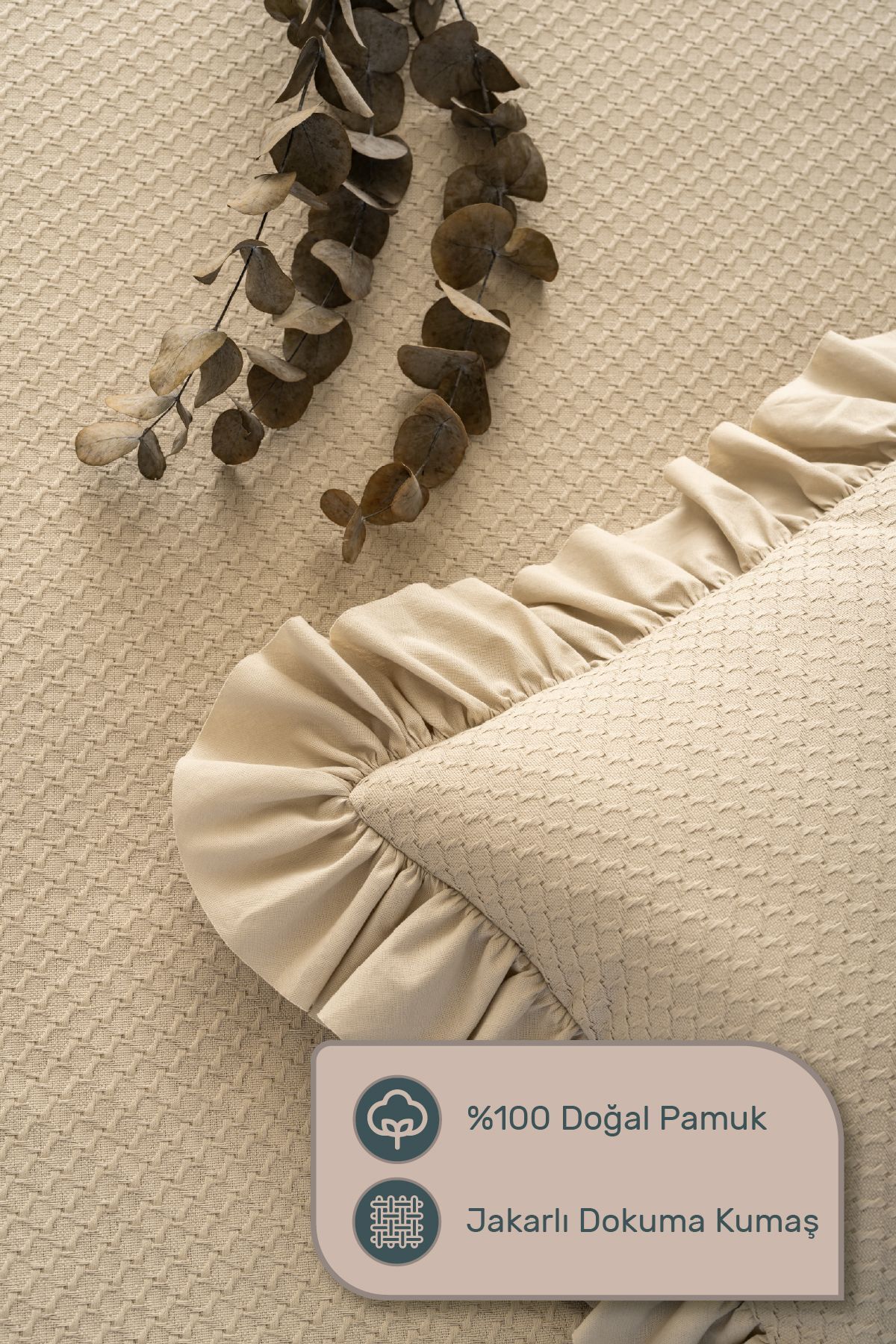 Odamoda Eva Çift Kişilik Pike Yatak Örtüsü Takımı BEJ – Pamuklu Fırfırlı Günlük Örtü Seti -Şık Kutu ve Paket