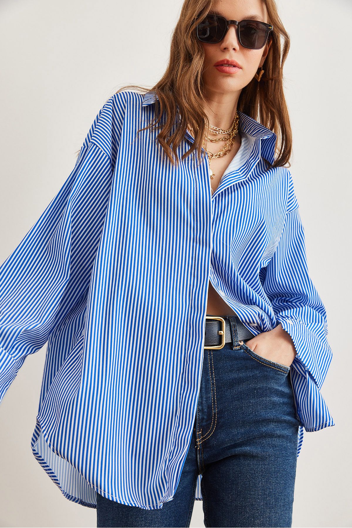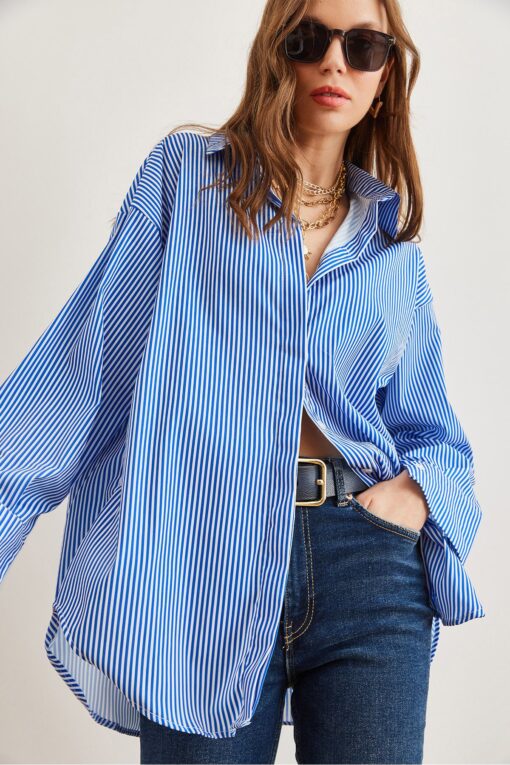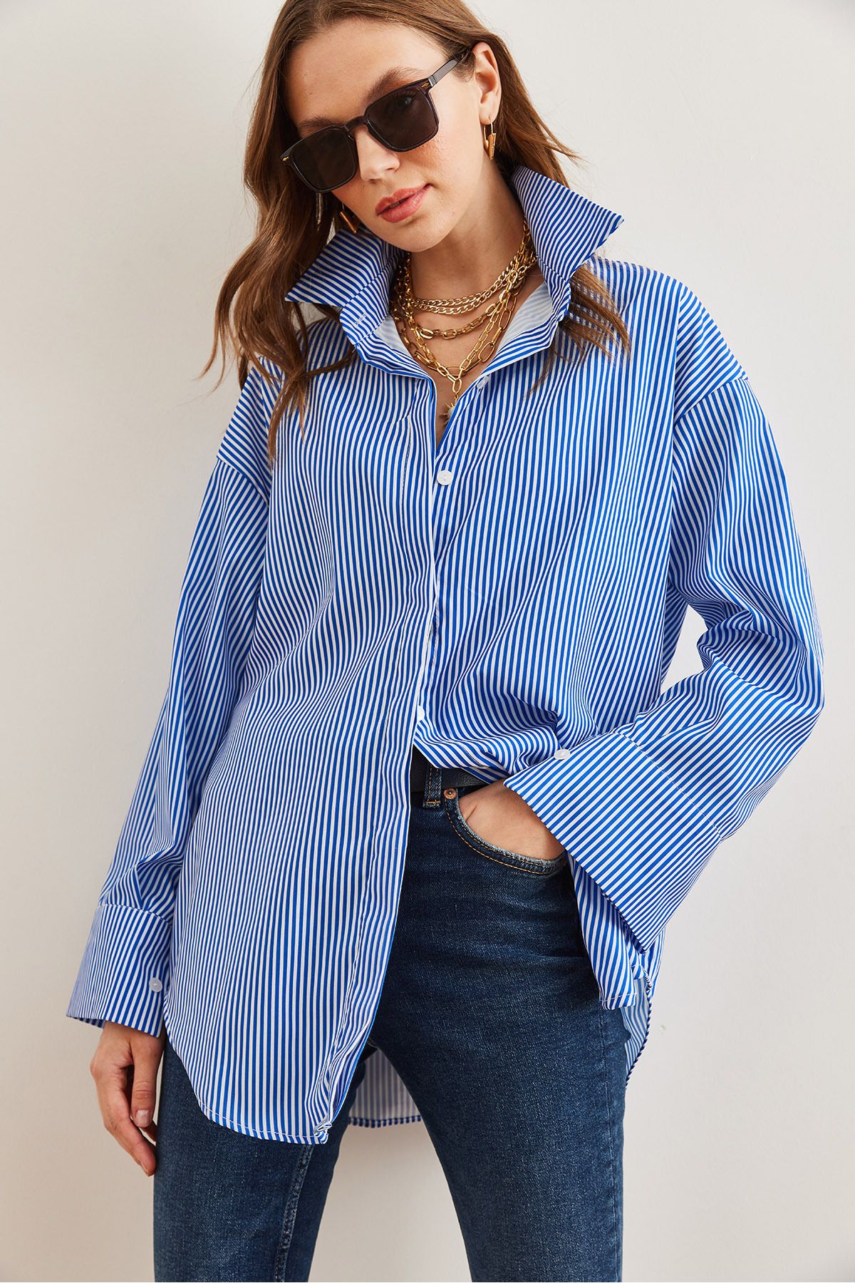 Olalook Kadın Çizgili Mavi Gizli Patlı Poplin Gömlek GML-19000867 en ucuz fiyata kozmetikara.com sitemizden sipariş verebilirsiniz.