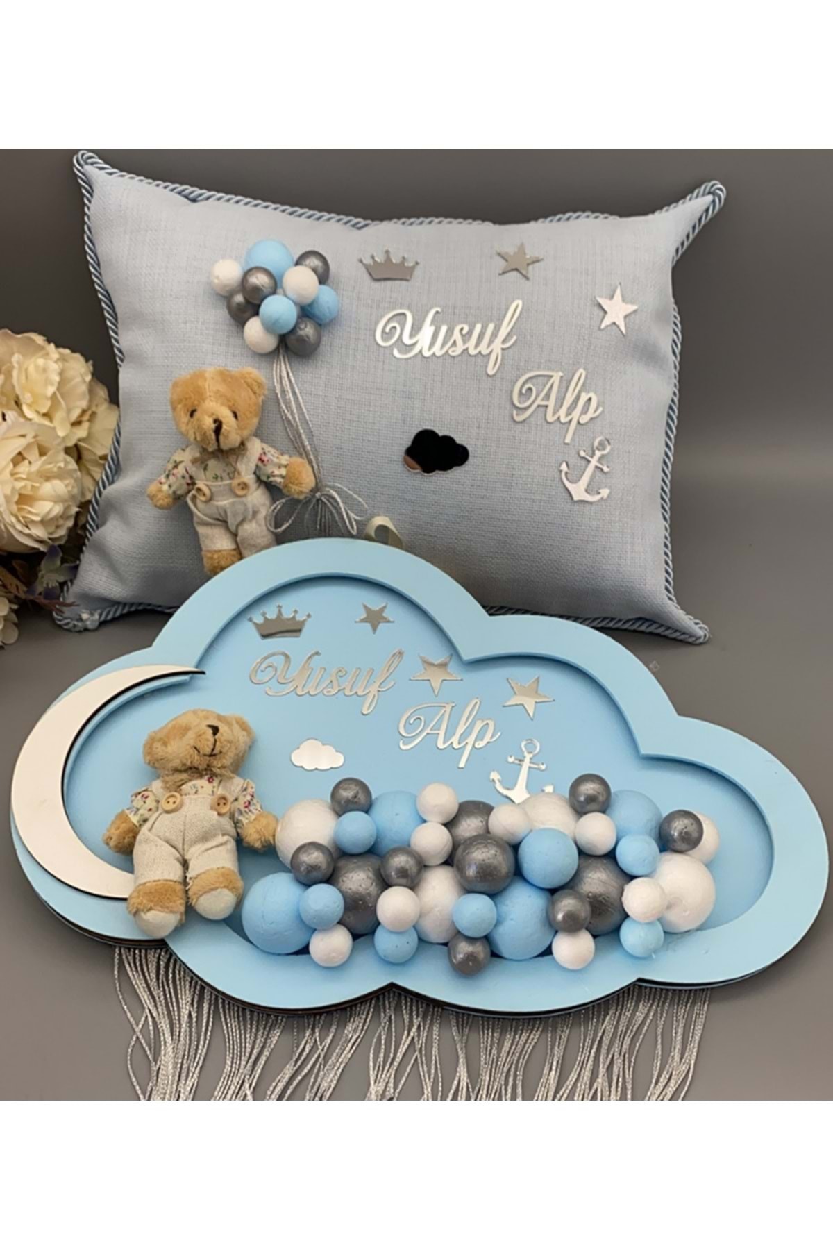 Organizasyon Pazarı Kişiye Özel İsim Yazılı Bulut Şekilli Mavi Renk Ahşap Kapı Süsü ve Baskılı Yastık Seti