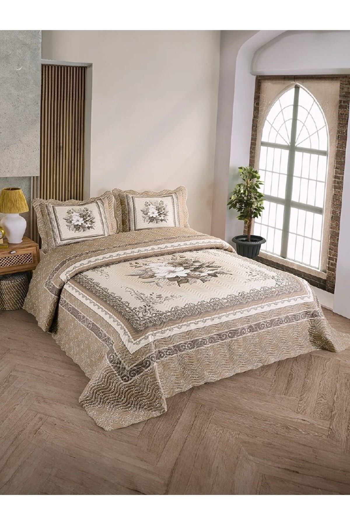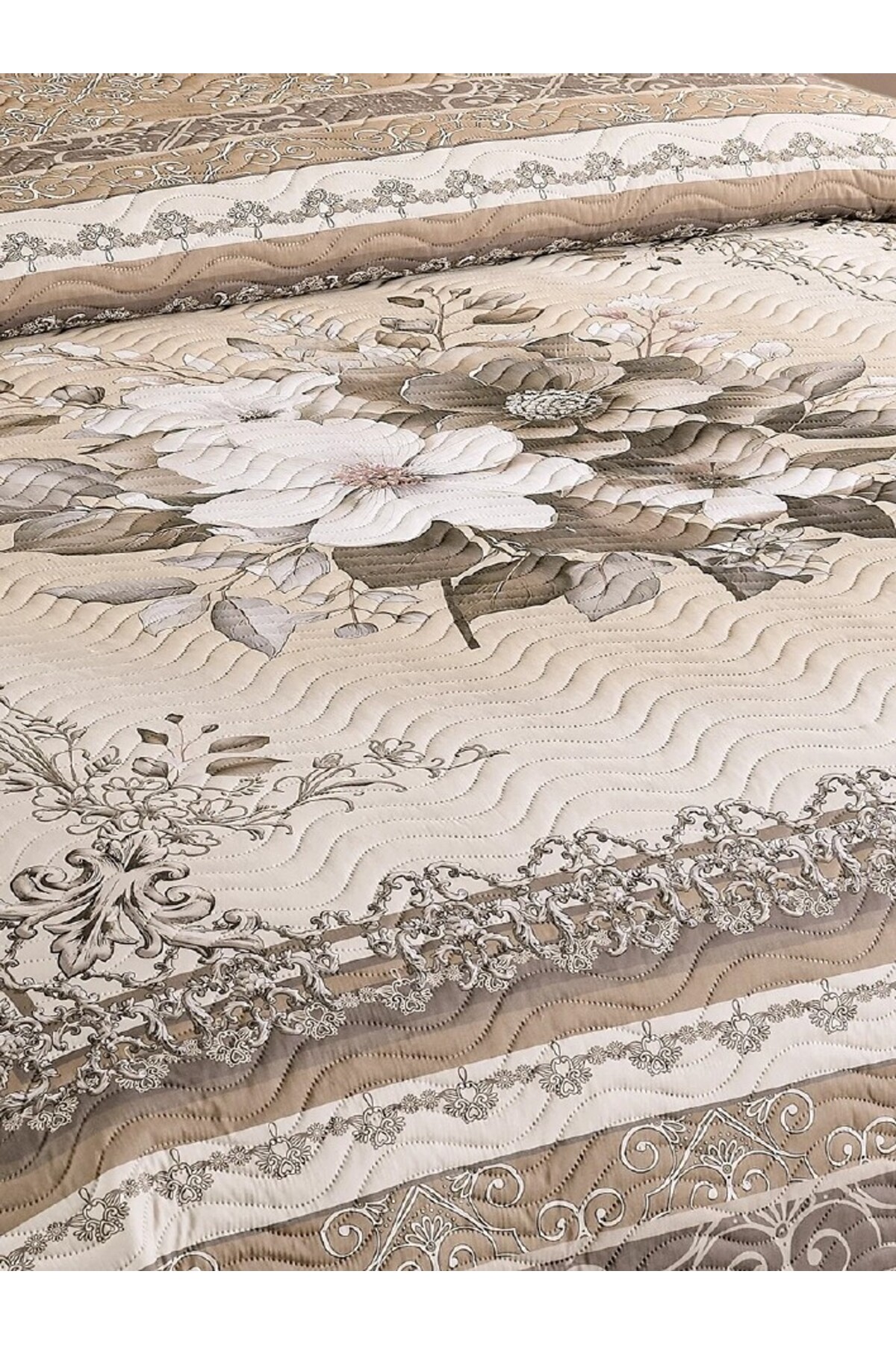 Çeyiz Diyarı Limena Dantelli Kapitoneli Ultrasonik Çift Kişilik Yatak Örtüsü Açık Cappucino