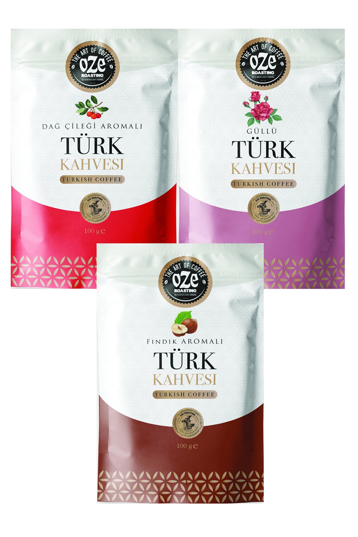 Oze Aromalı Türk Kahvesi Seti Dağ Çilekli, Güllü, Fındıklı 3'lü 100g ürünü ucuz fiyat, hızlı kargo imkanı ile hemen sitemizden sipariş verin.