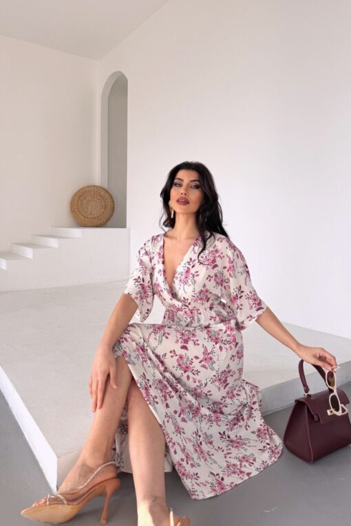 Pek Moda Kadın Krem Fuşya Pembe Çiçek Desenli Volan Etekli Uzun Abiye Mezuniyet Yazlık Elbise en ucuz fiyata kozmetikara.com sitemizden sipariş verebilirsiniz.