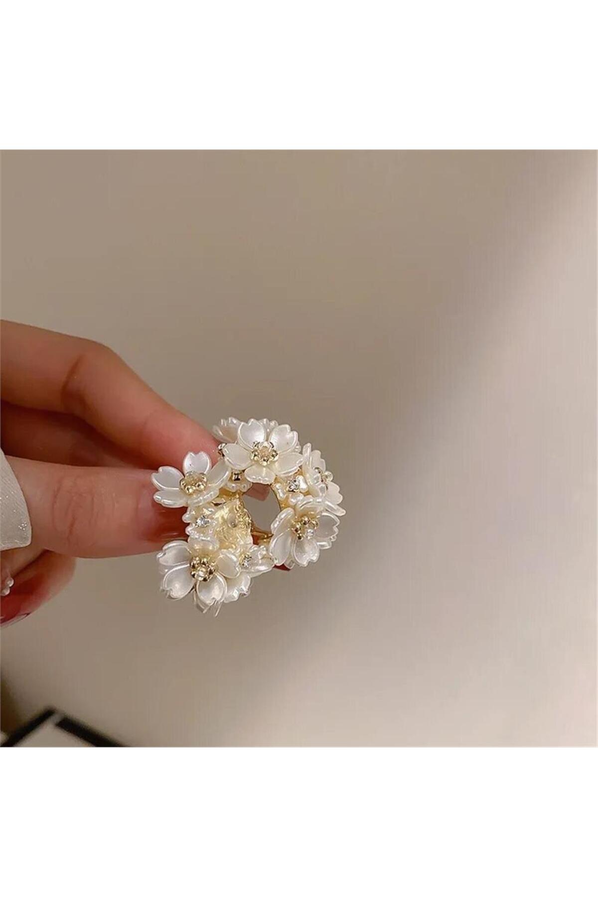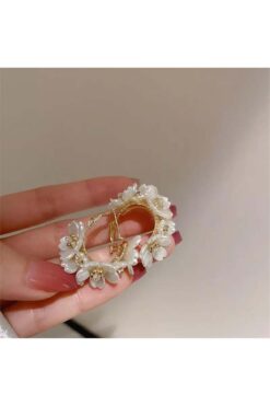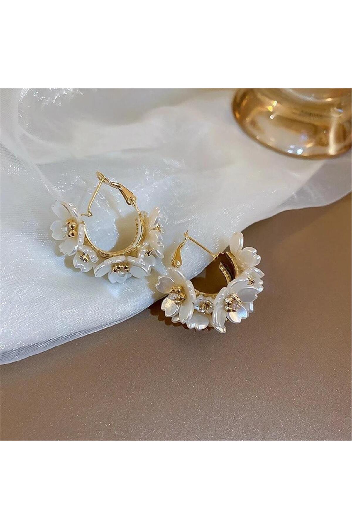 Pelin Aksesuar Beyaz Çiçek İşlemeli Halka Küpe