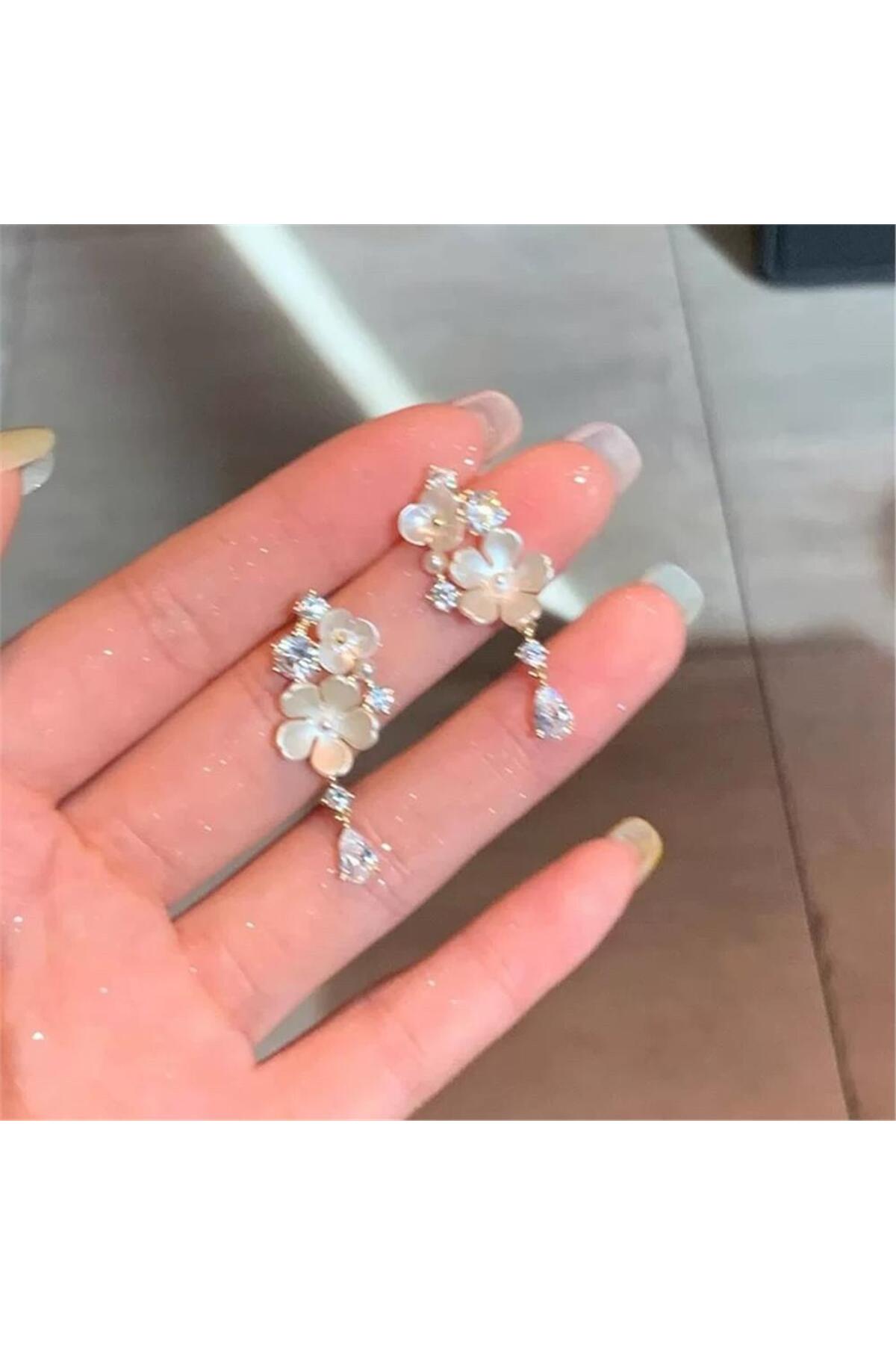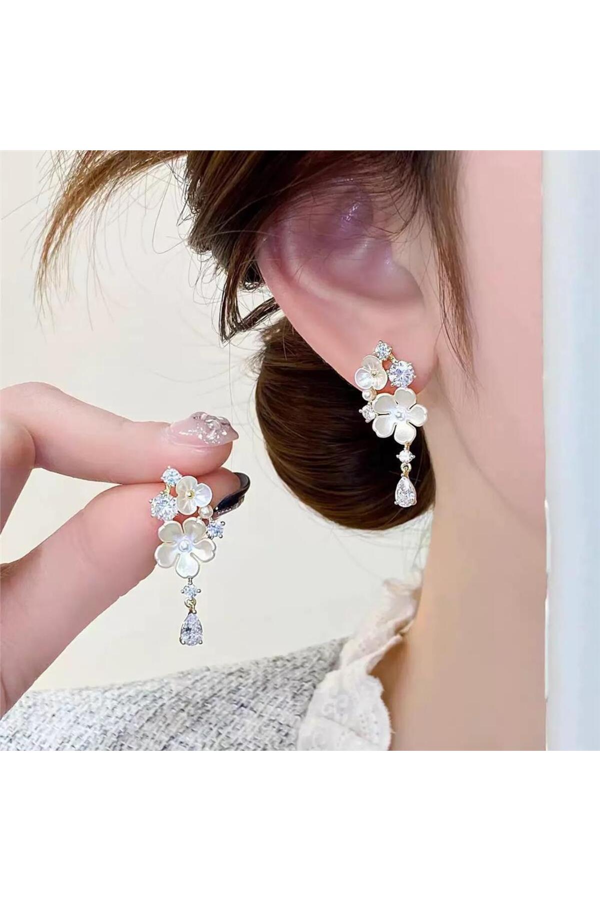 Pelin Aksesuar Beyaz Sedefli Çiçek ve Kristal Damla Sallantılı Küpe