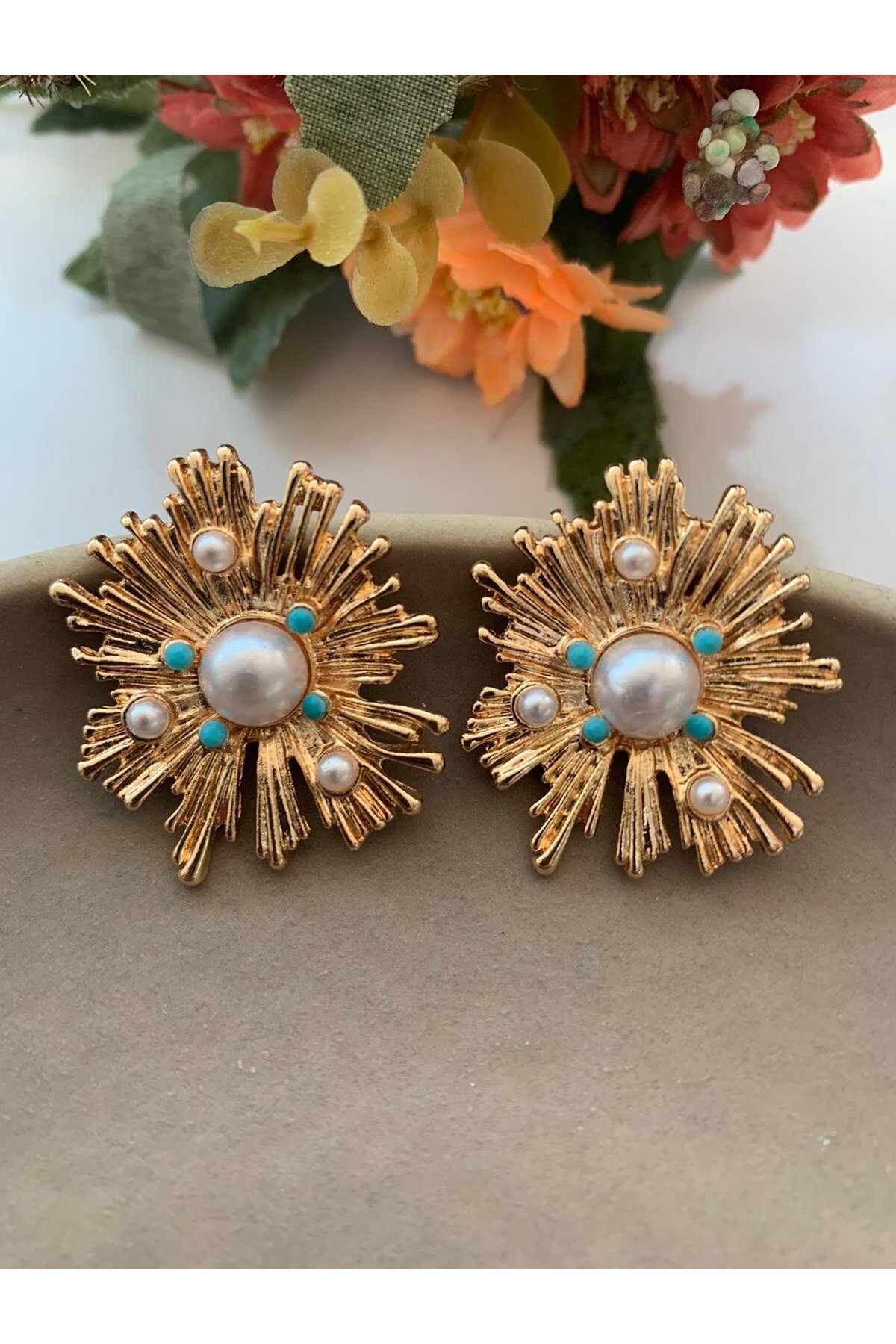 Pelin Aksesuar İncili Mavi Taşlı Büyük Çiçek Küpe