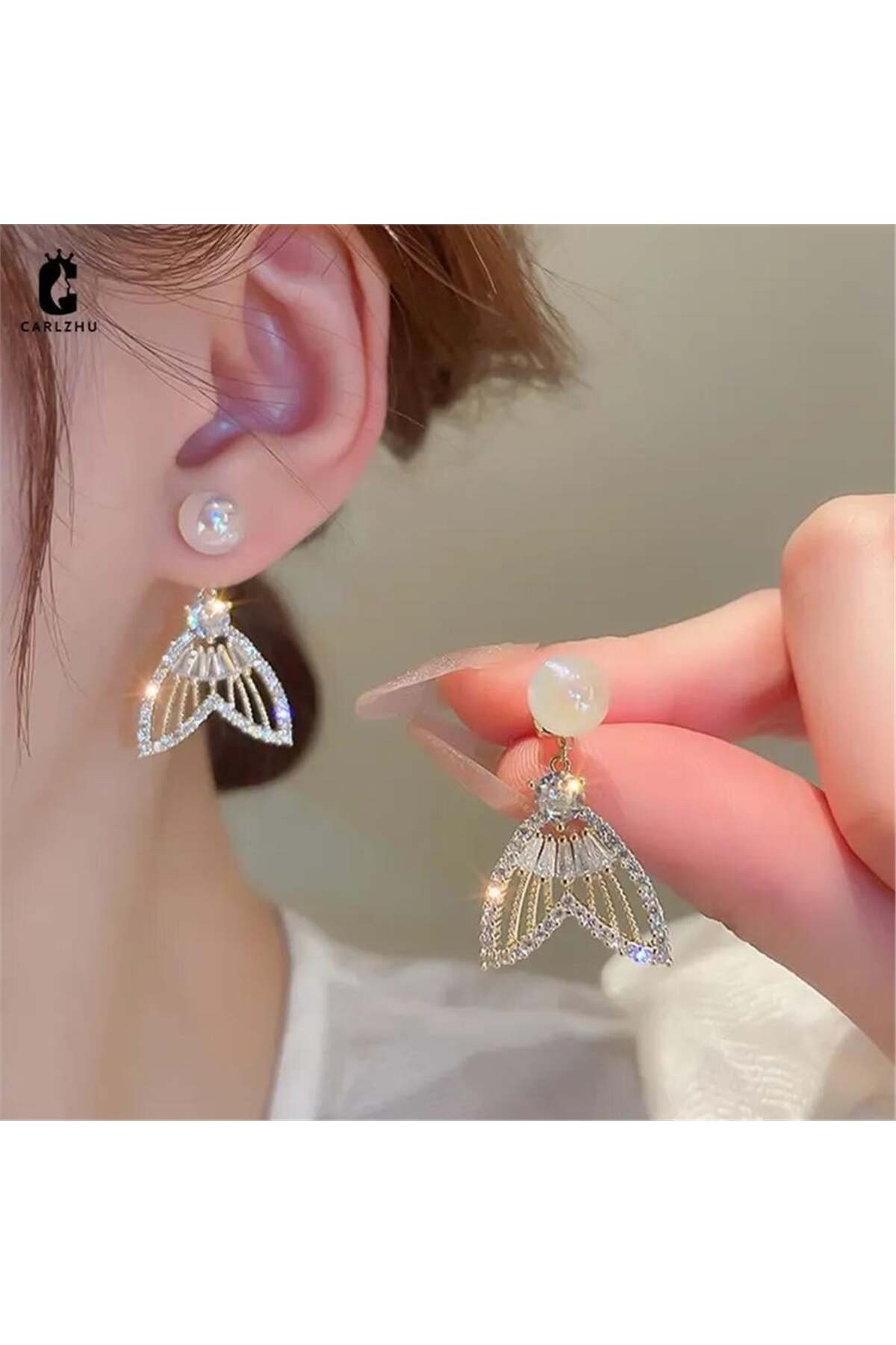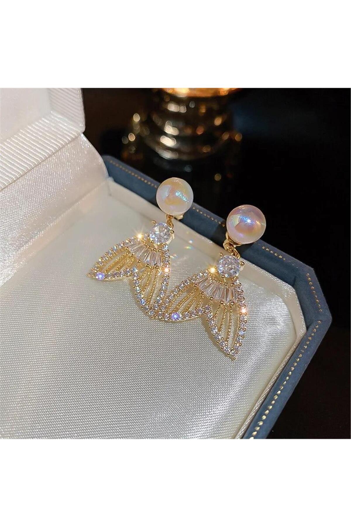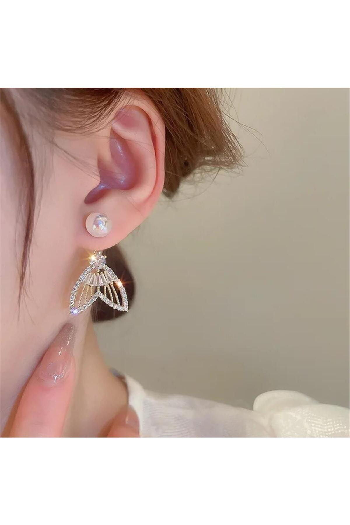 Pelin Aksesuar İncili Taşlı Hayalet Balık Kuyruğu Küpe