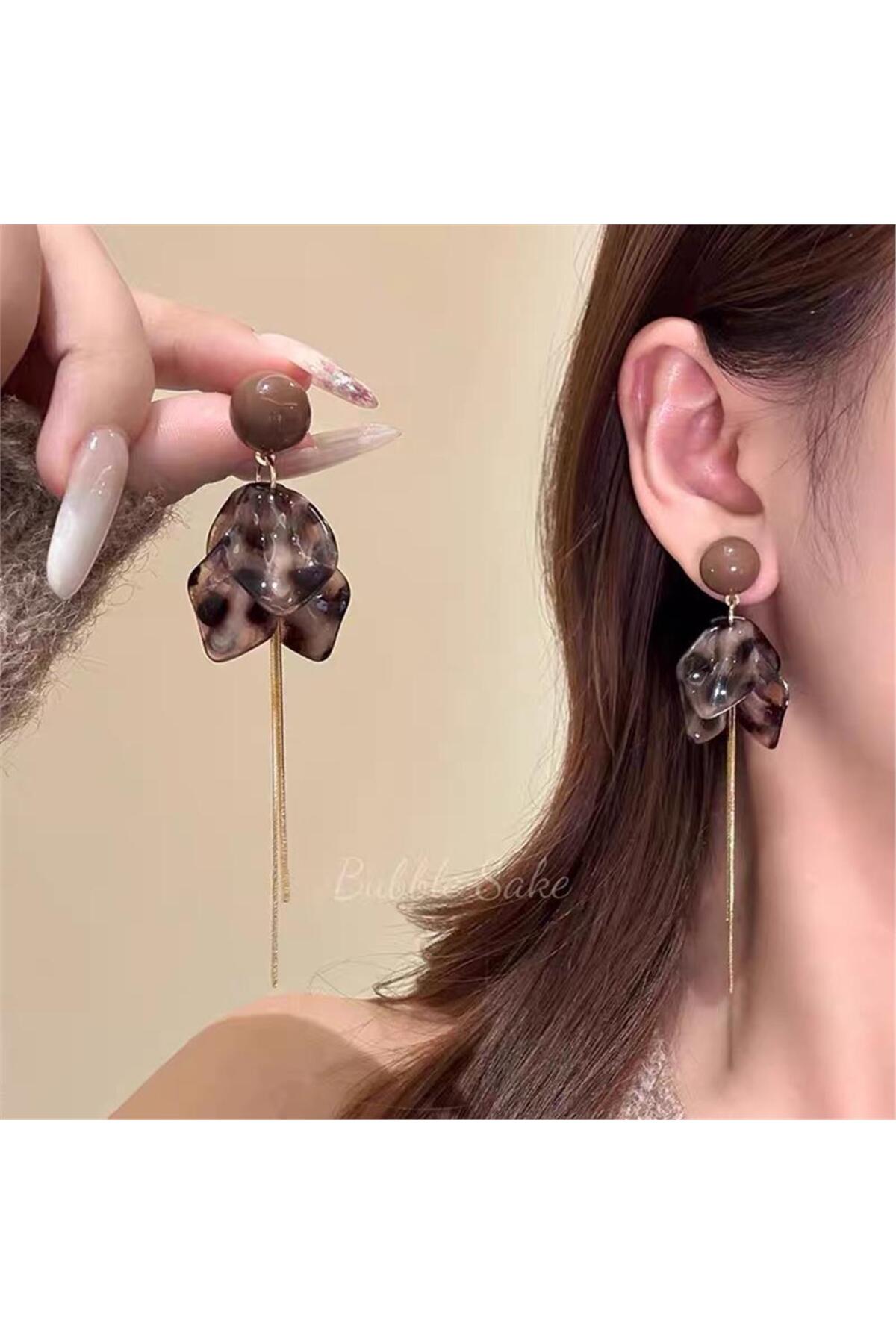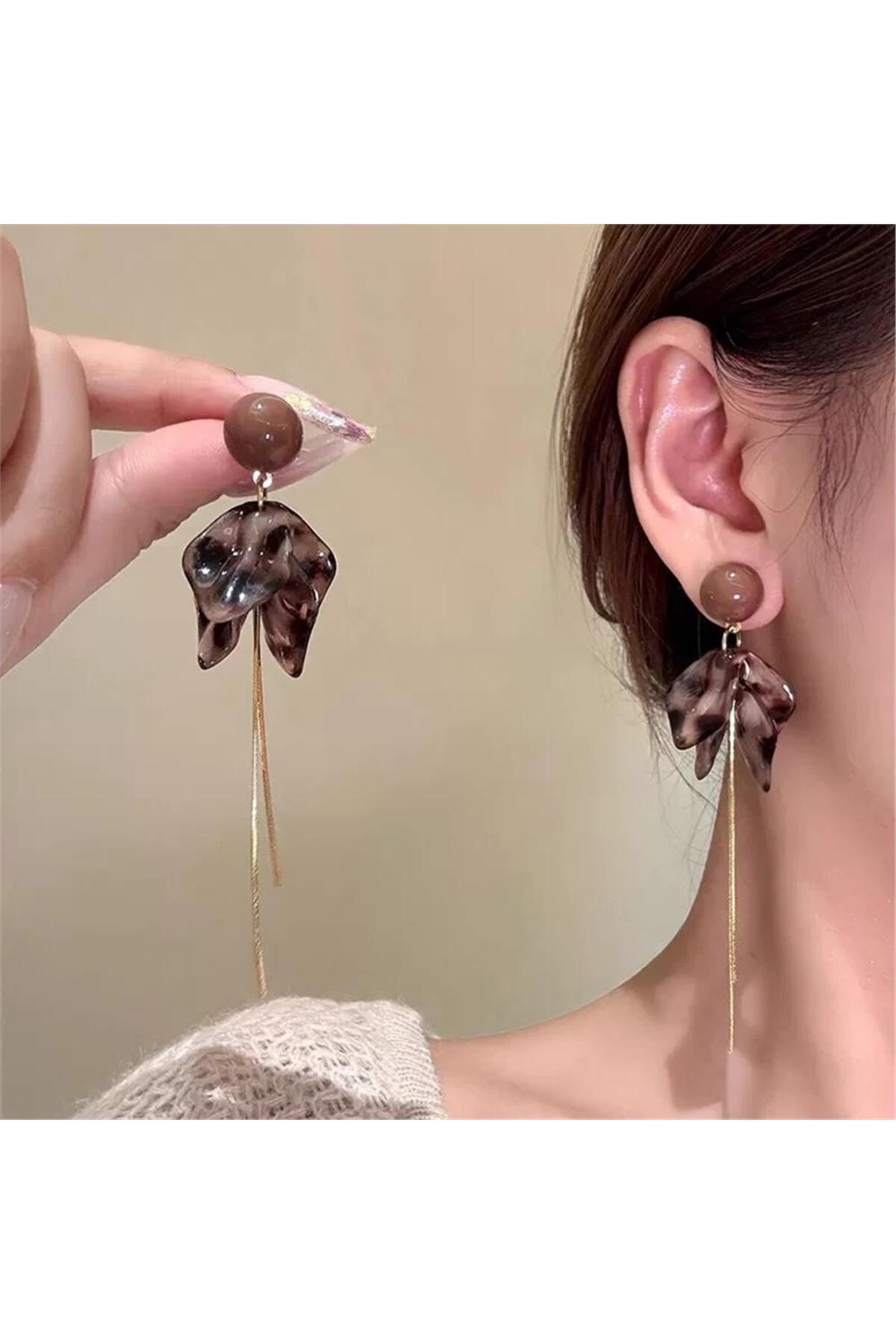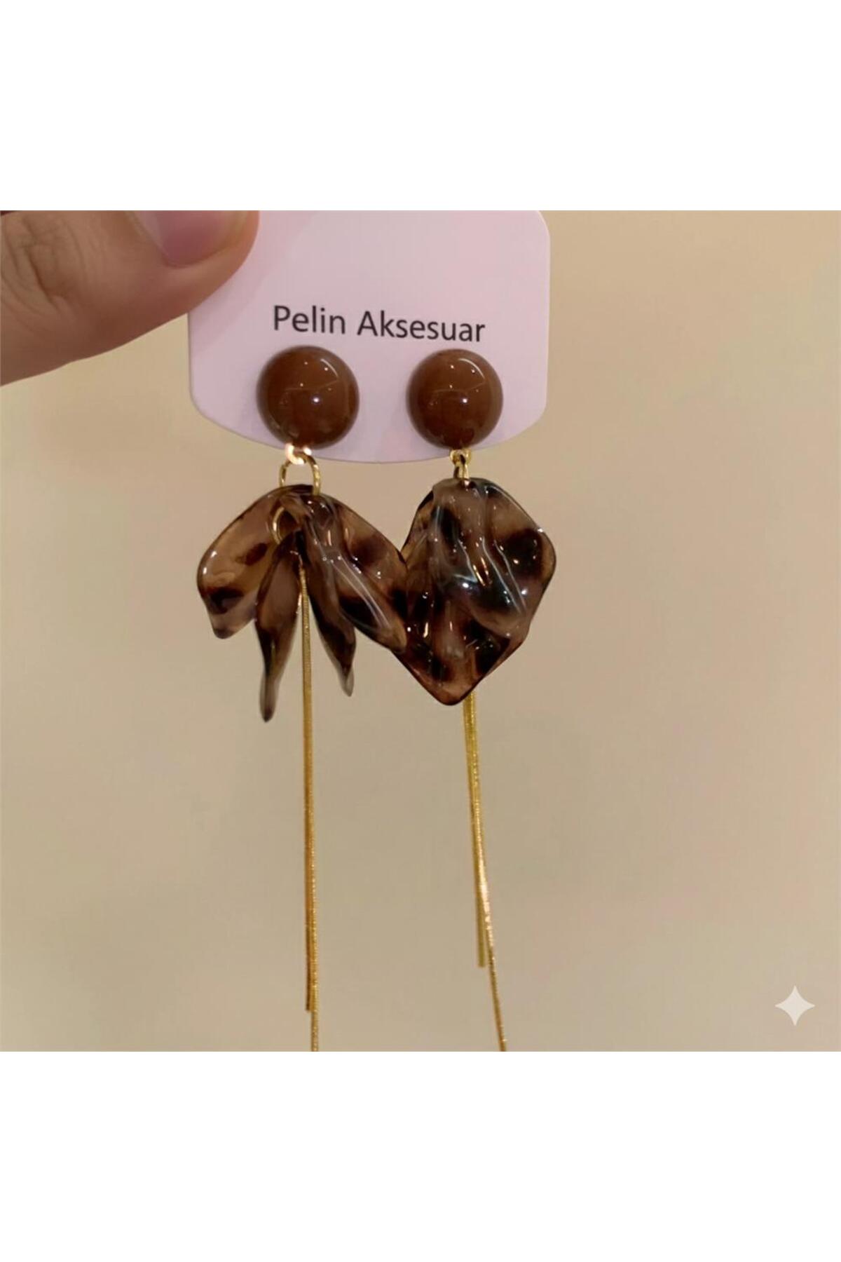 Pelin Aksesuar Kahve Tonlu Akrilik Yaprak ve Zincir Püsküllü Küpe