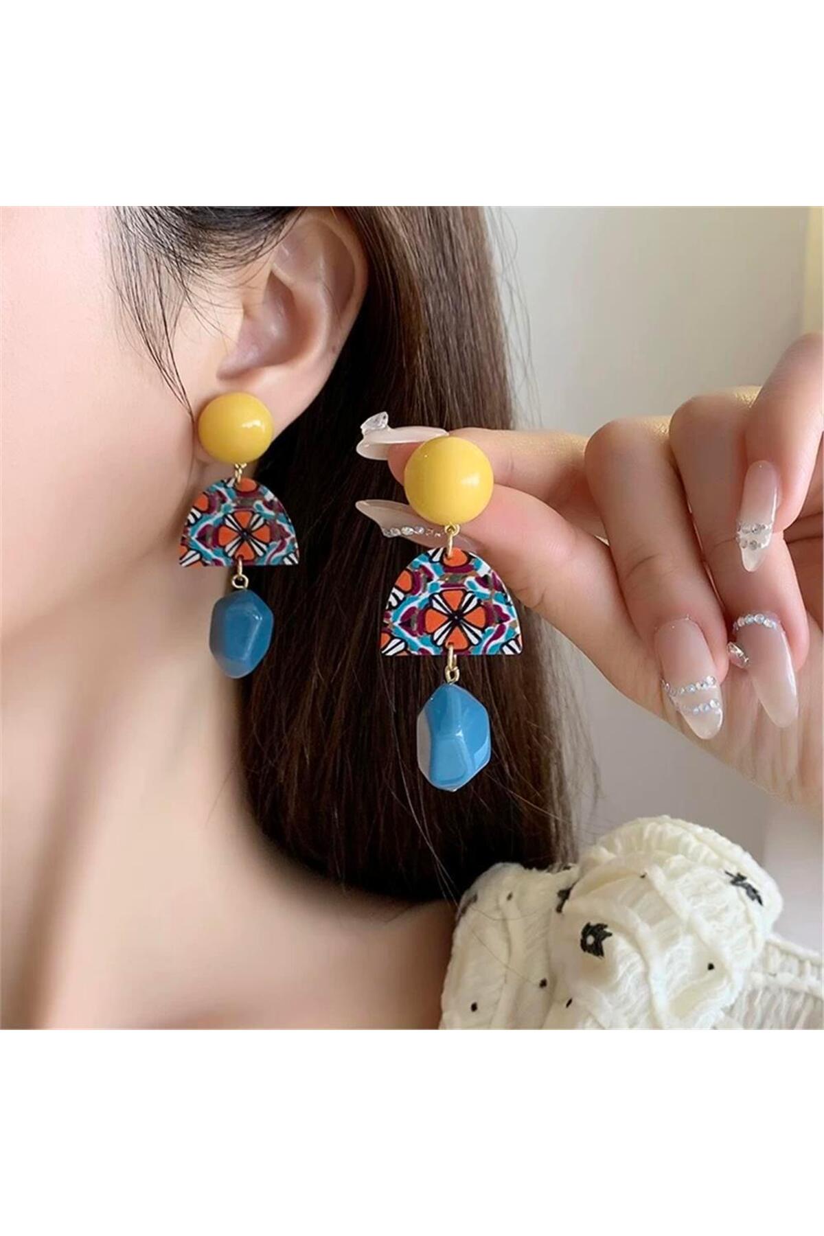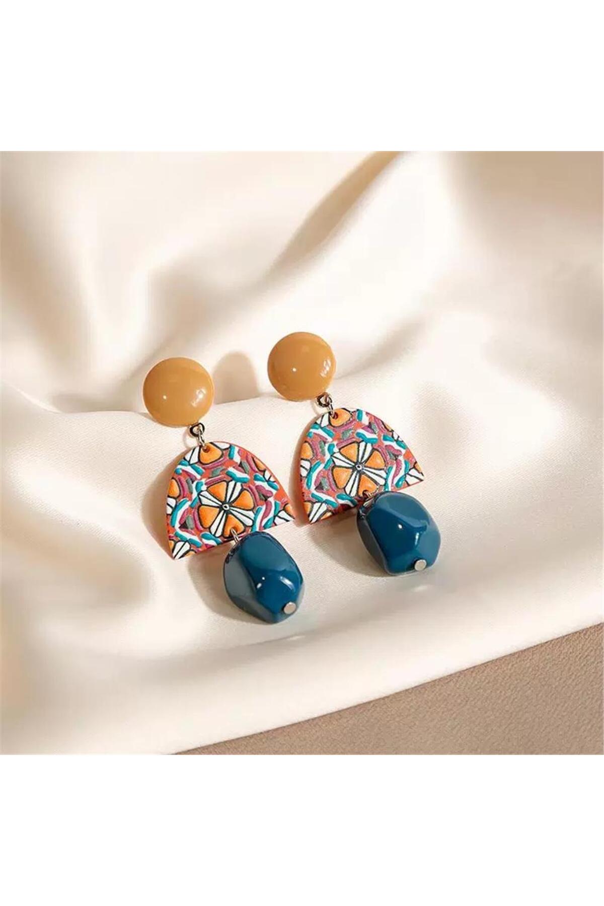 Pelin Aksesuar Mavi Sarı Etnik Desenli Küpe