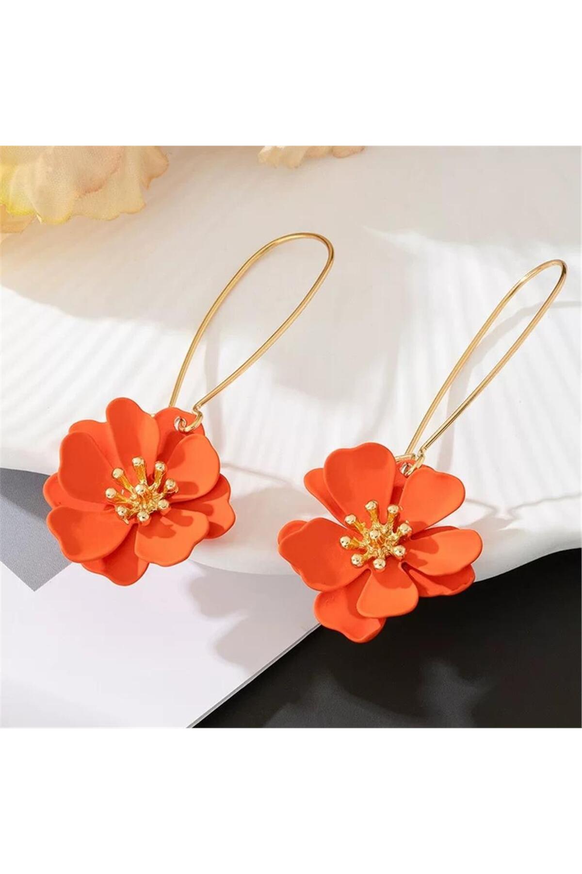 Pelin Aksesuar Turuncu Mat Yapraklı Büyük Çiçek Uzun Kancalı Küpe