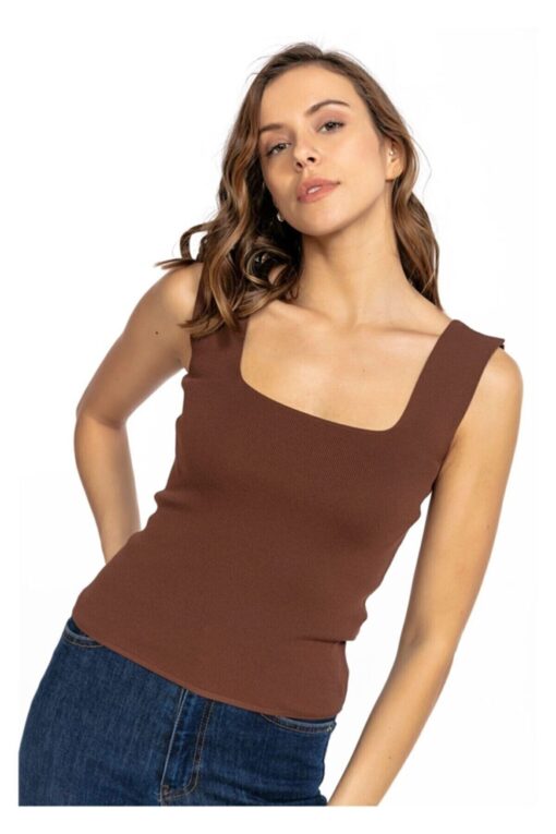 Pinpery Kadın Kahve Rengi Kare Yaka Askılı Triko Bluz Atlet