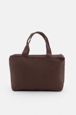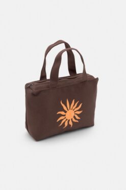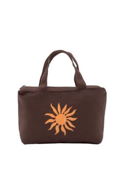 Kontrast güneş grafikli, kahverengi mini tote çanta, tutma saplı ve %100 pamuk kumaştan üretilmiştir.