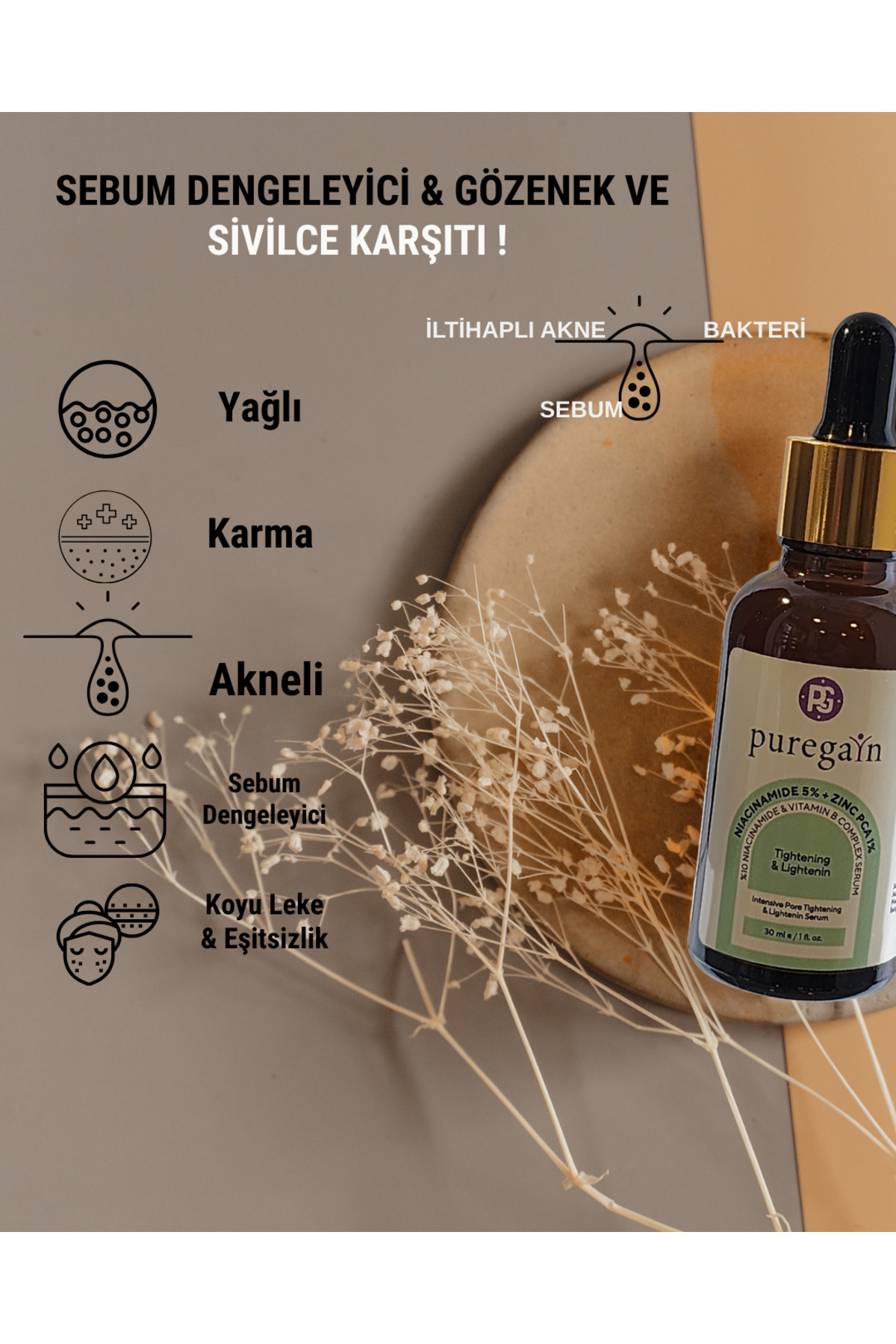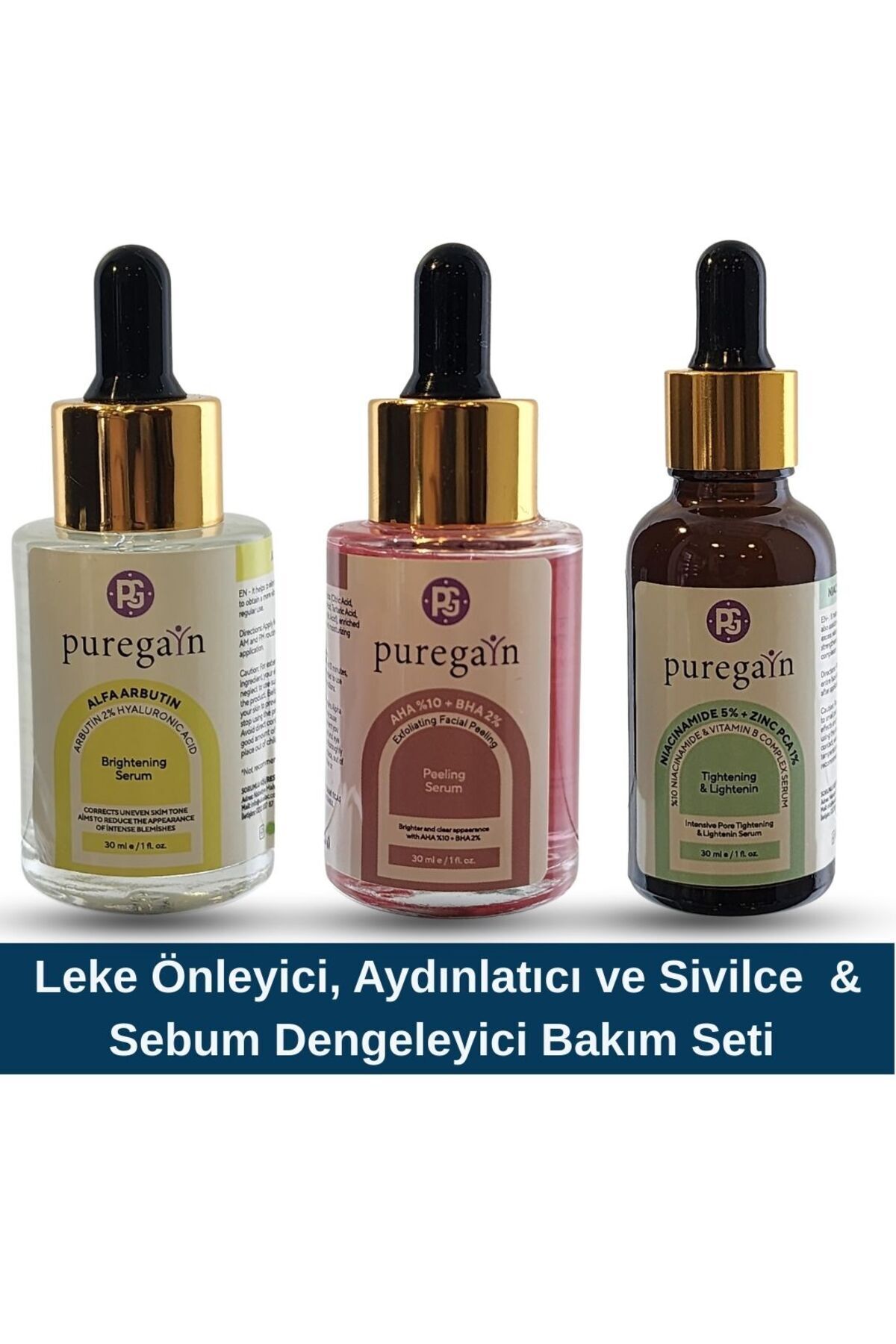 PUREGAIN Alpha Arbutin Serum + AHA BHA + Niacinamide Serum – Leke Karşıtı, Gözenek Sıkı, Cilt Tonu Eşit