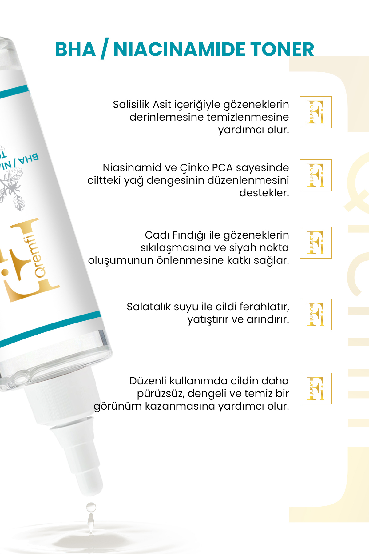 Qremfi Akne Karşıtı Gözenek Sıkılaştırıcı BHA Salisilik ve Niacinamide Tonik 200 ml ürününü en uygun fiyata kozmetikara.com sitemizden sipariş verebilirsiniz.