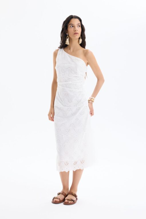 Quzu Fisto Detaylı Tek Omuz Midi Elbise Beyaz