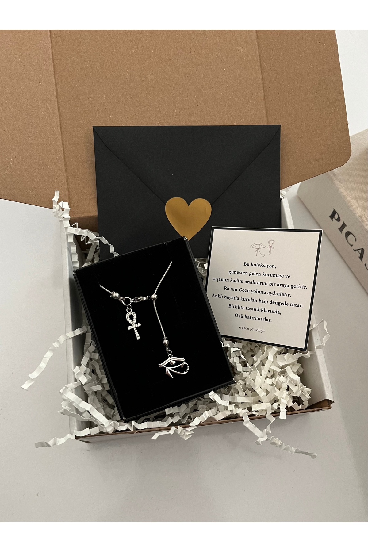 RAREE Ankh ve ra’nın gözü charmlı çelik asansörlü y kolye özel notlu hediyelik