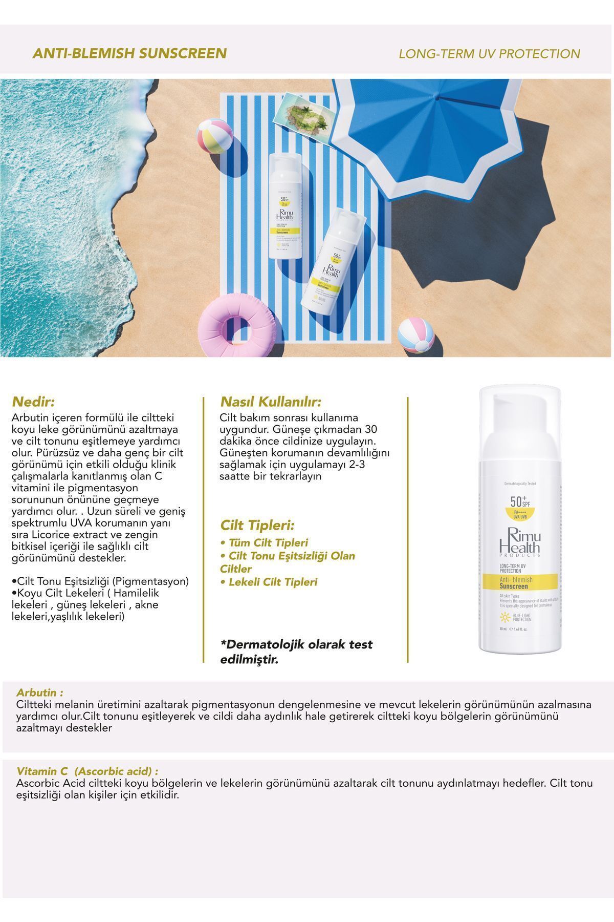 Rimu Health Products Lekeli Ciltler Için Cilt Tonu Eşitleyici Aydınlatıcı Güneş Kremi 50 ml